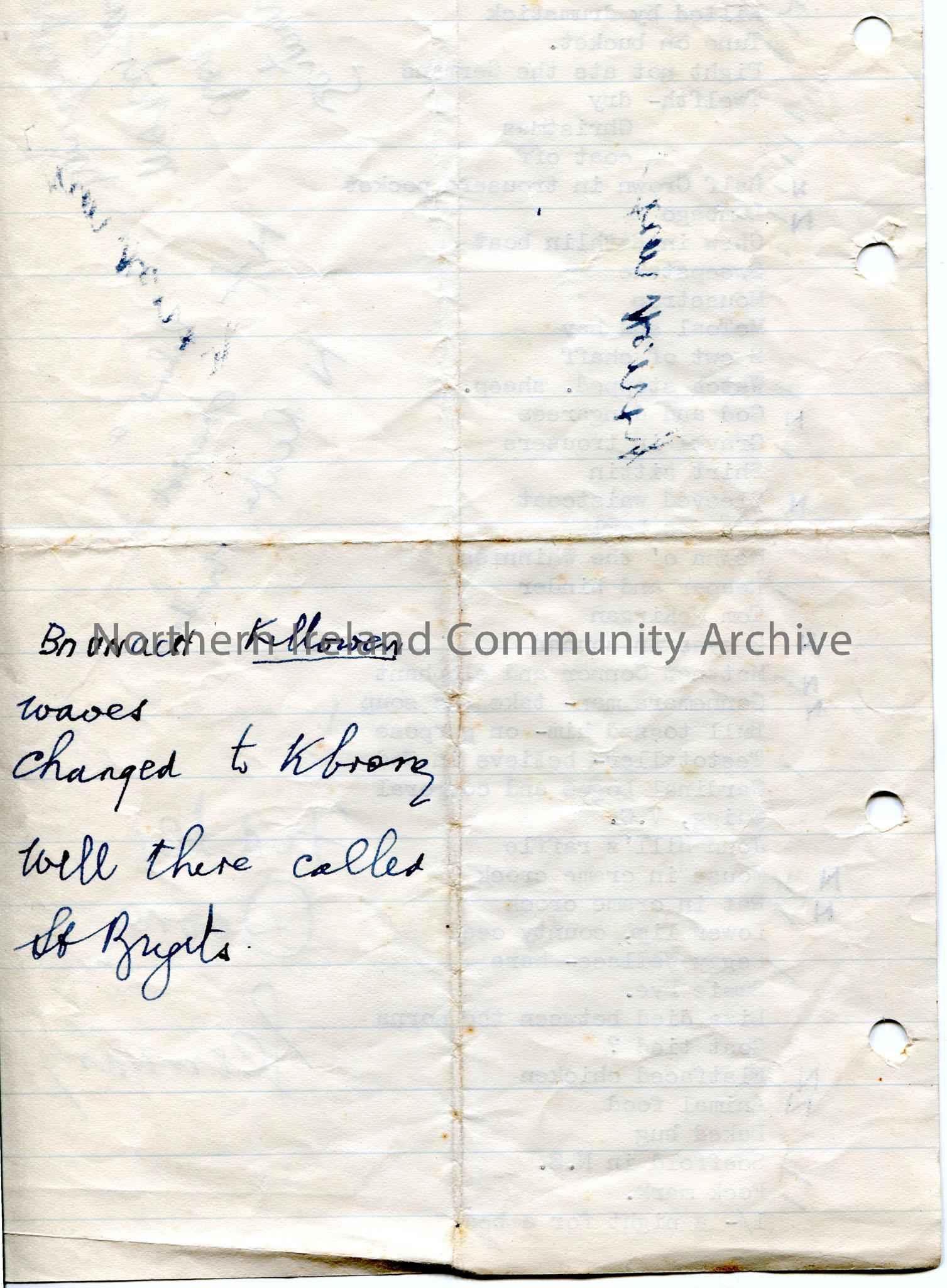 Typed list titled, 'Malone House, Purdysburn, Antrim Castle; Feb 5th and 6th 1943. Jokes:- 6th Light Battery, 27th Oct 1939'. Handwritten notes to right of list, not in context. Handwritten note on back of page mentions Killowen.