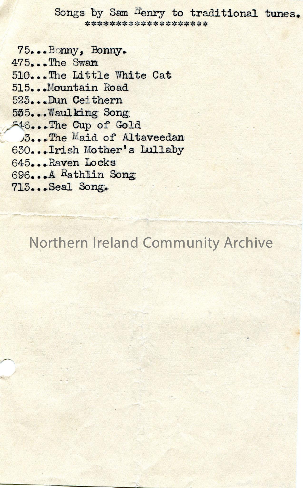 Typed list titled, ‘Songs by Sam Henry to traditional tunes’. List of 12 songs which are numbered. Begins with ‘Bonny, Bonny’ and ends with ‘Seal Song…