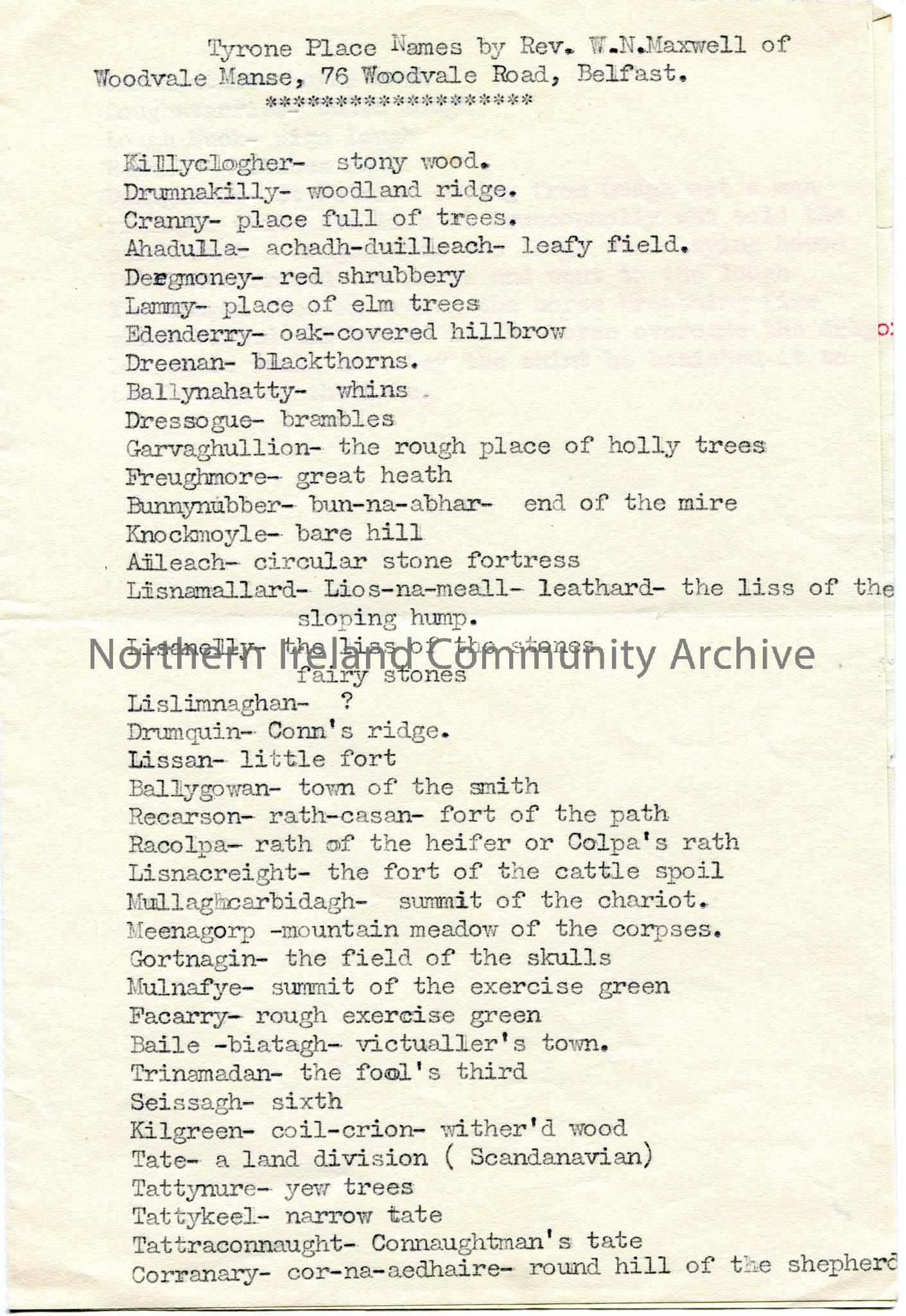 Typed list titled, ‘Tyrone Place Names by Rev. W. N. Maxwell of Woodvale Manse, 76 Woodvale Road, Belfast’. Story re St Patrick and dragon at lough ne…