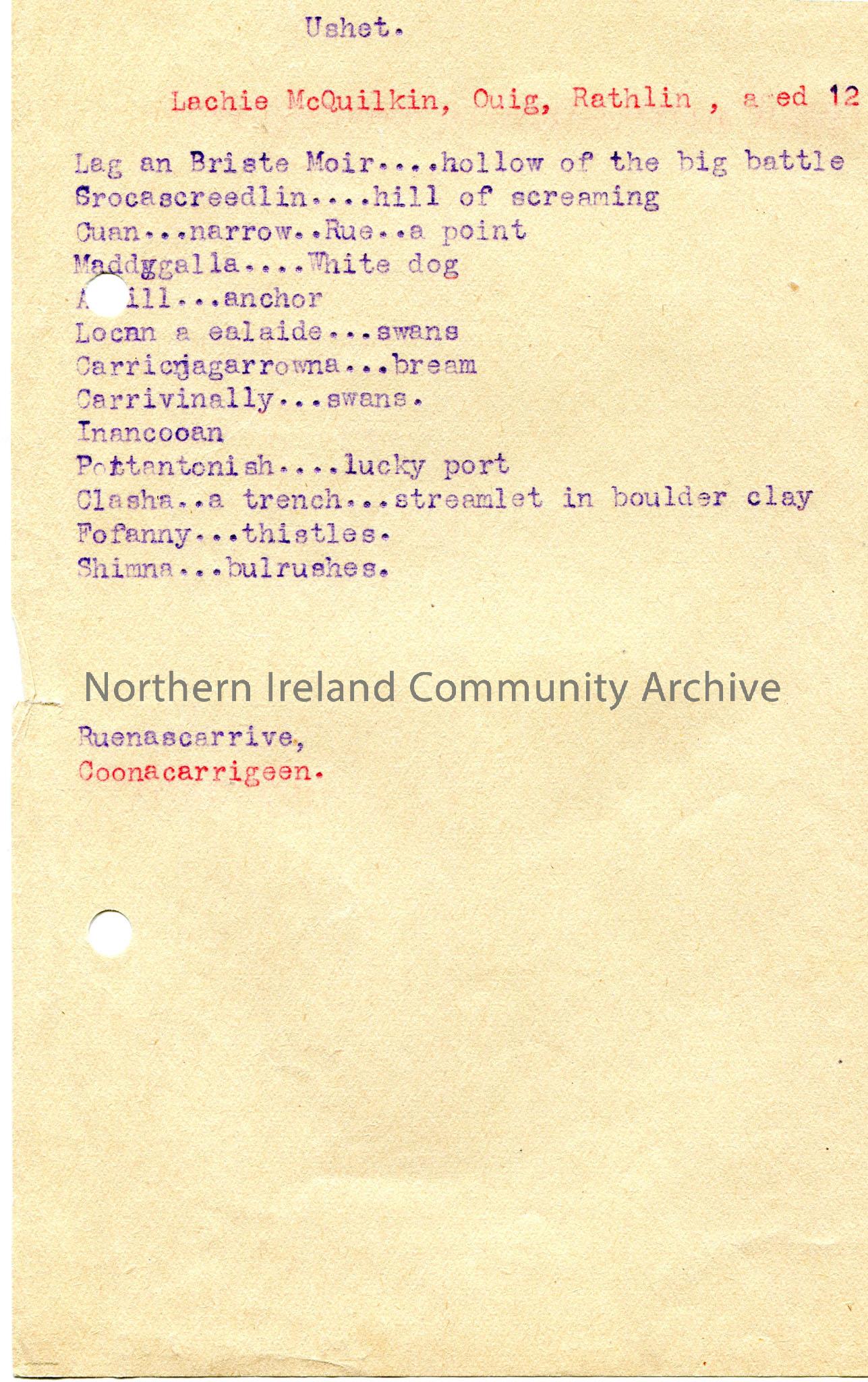 Typed list titled 'Ushet' Lachie McQuilkin, Quig, Rathlin, aged 12. See CM:2015:929.234 for a photo of Loughie (his preferred spelling), probably taken during the same visit to Rathlin, c.1935.