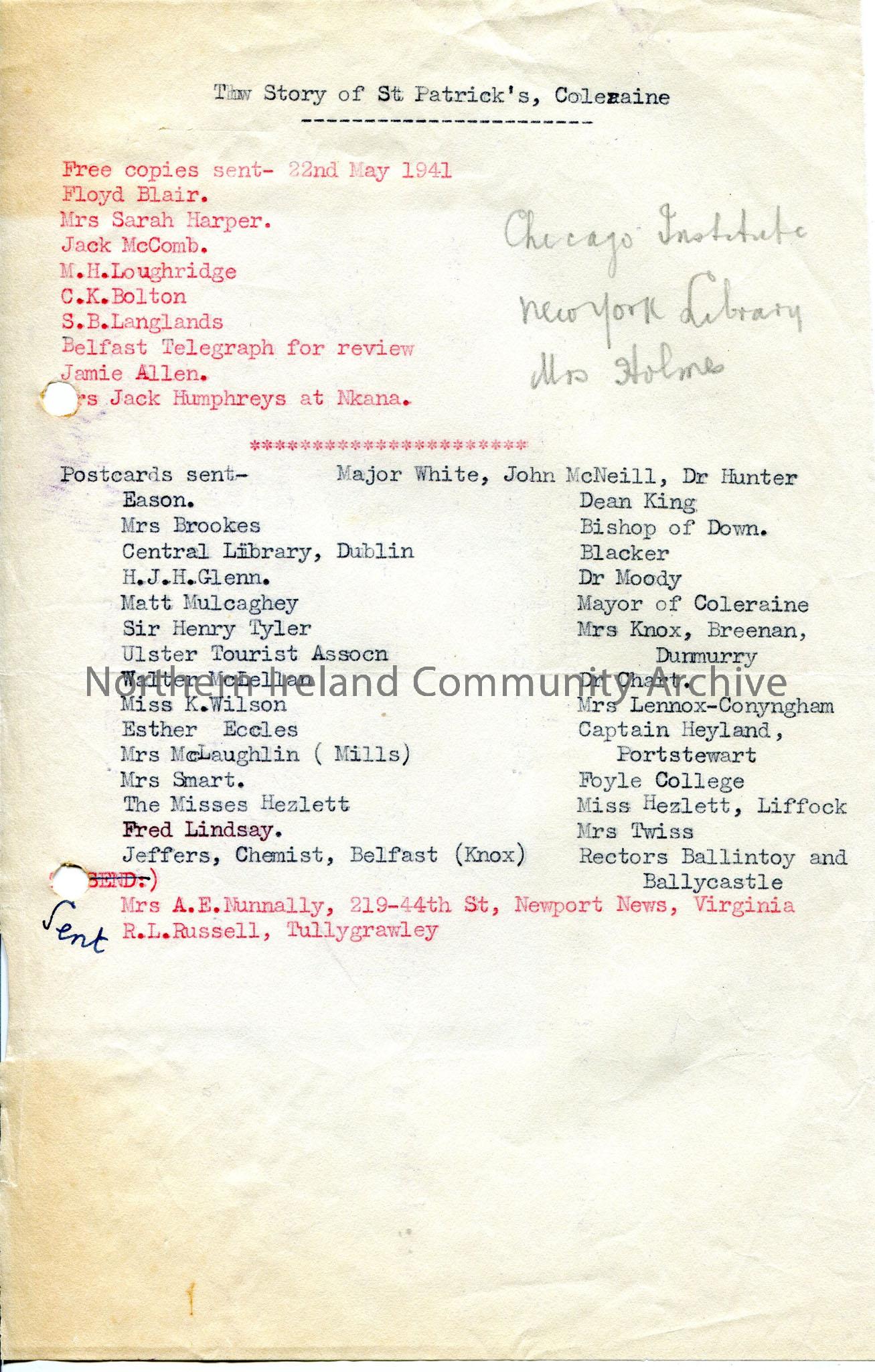 Typed list, under heading 'The Story of St Patrick's, Coleraine' [written by Sam Henry]. Names of those who received free copies and list of those who received the advertising postcard - local, Dublin and USA