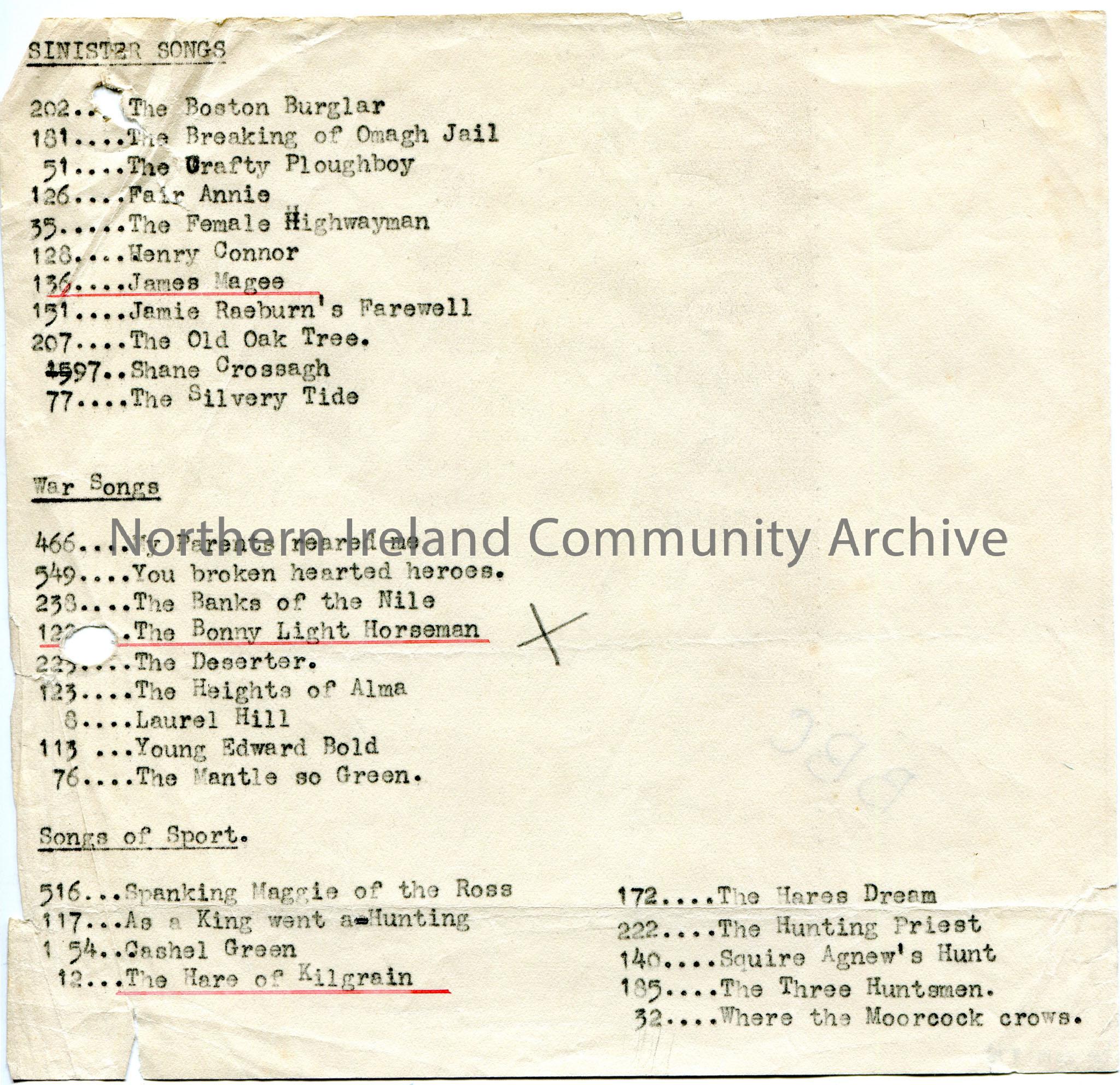 Typed lists of songs categorised as ‘Sinister Songs’, ‘War Songs’ and ‘Songs of Sport’. Three songs are underlined in red and there is an X is pencil …