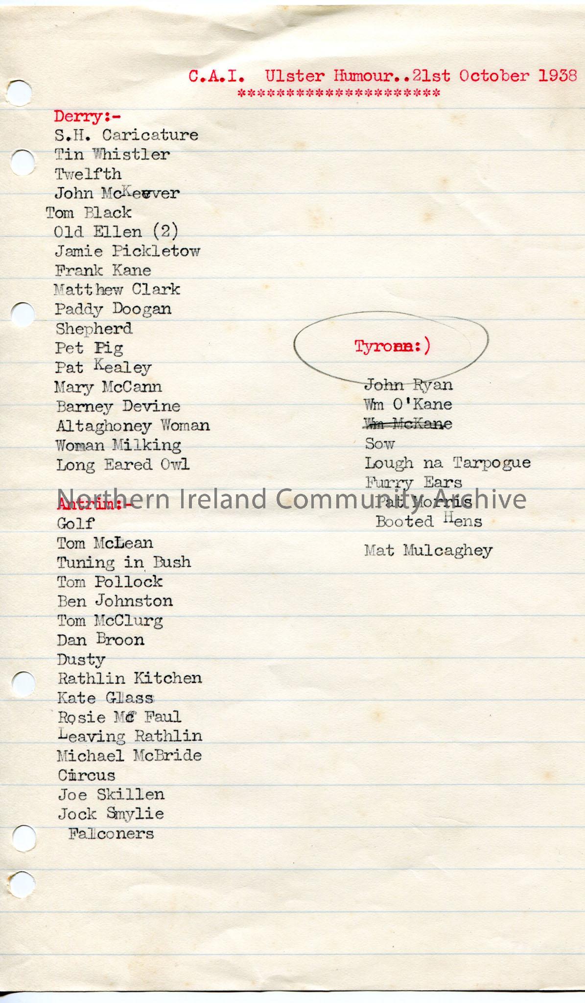 Typed lists re Derry, Antrim and Tyrone for lecture at C.A.I. ‘Ulster Humour’ on 21st October, 1938. Tyrone is circled in pencil.