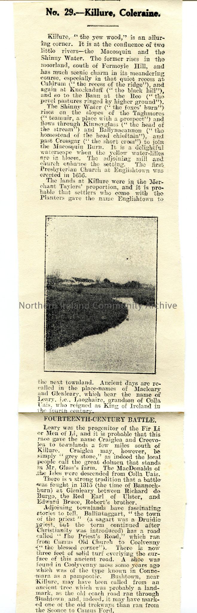 Typed newspaper article entitled 'No 29 - Killure, Coleraine' - history of area with photo, mentioning Andrew Orr as native of area [he went to Killure school].