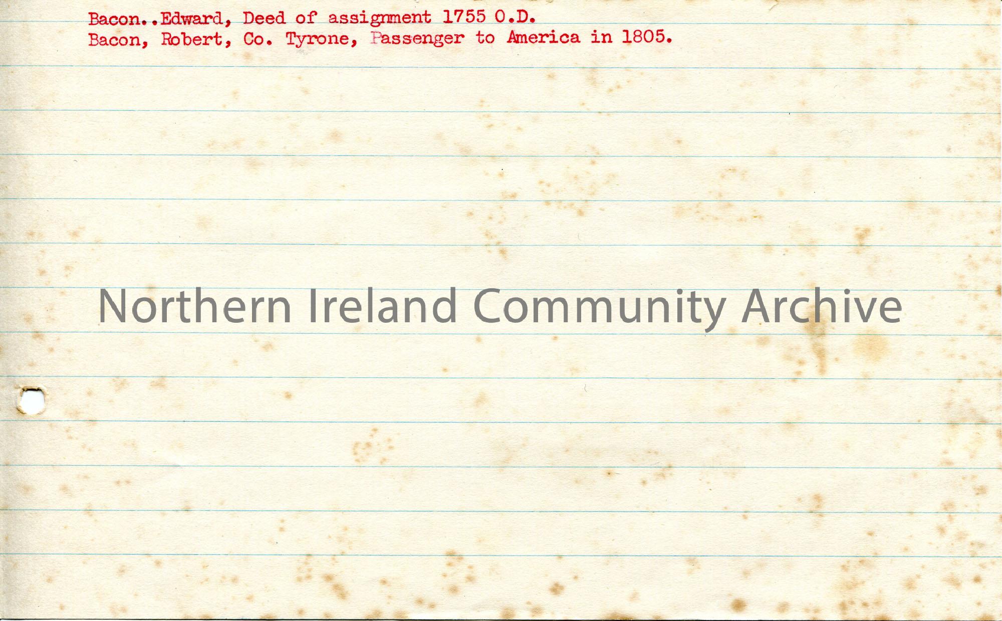Typed note in red ink on lined paper. Reads, ‘Bacon..Edward, Deed of assignment 1755 O.D.’ and ‘Bacon, Robert, Co. Tyrone, Passenger to America in 180…