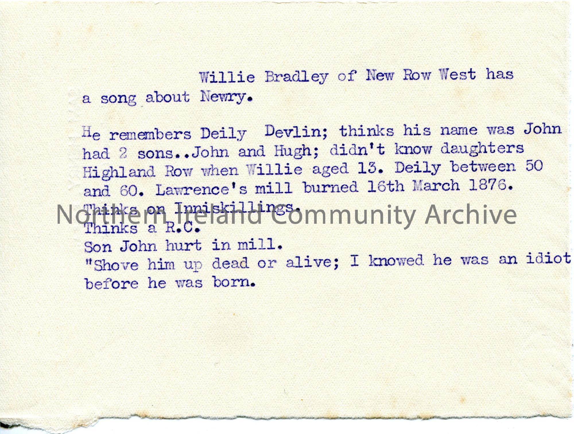 Typed note on back of Sam Henry’s personal headed paper re family history information from Willie Bradley of New Row West about Deily Devlin, Highland…