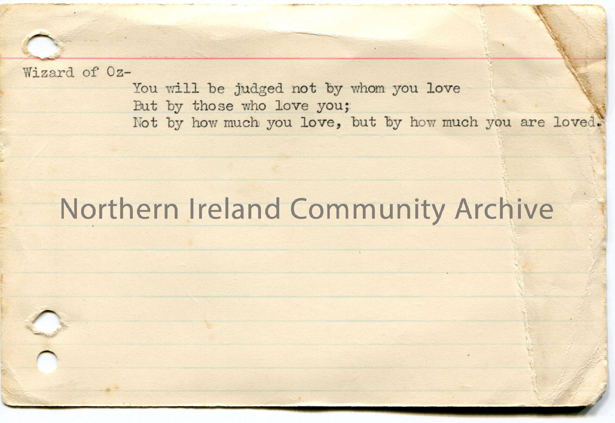 Typed note on lined card re quote from the Wizard of Oz. Begins, ‘You will be judged not by whom you love…’.