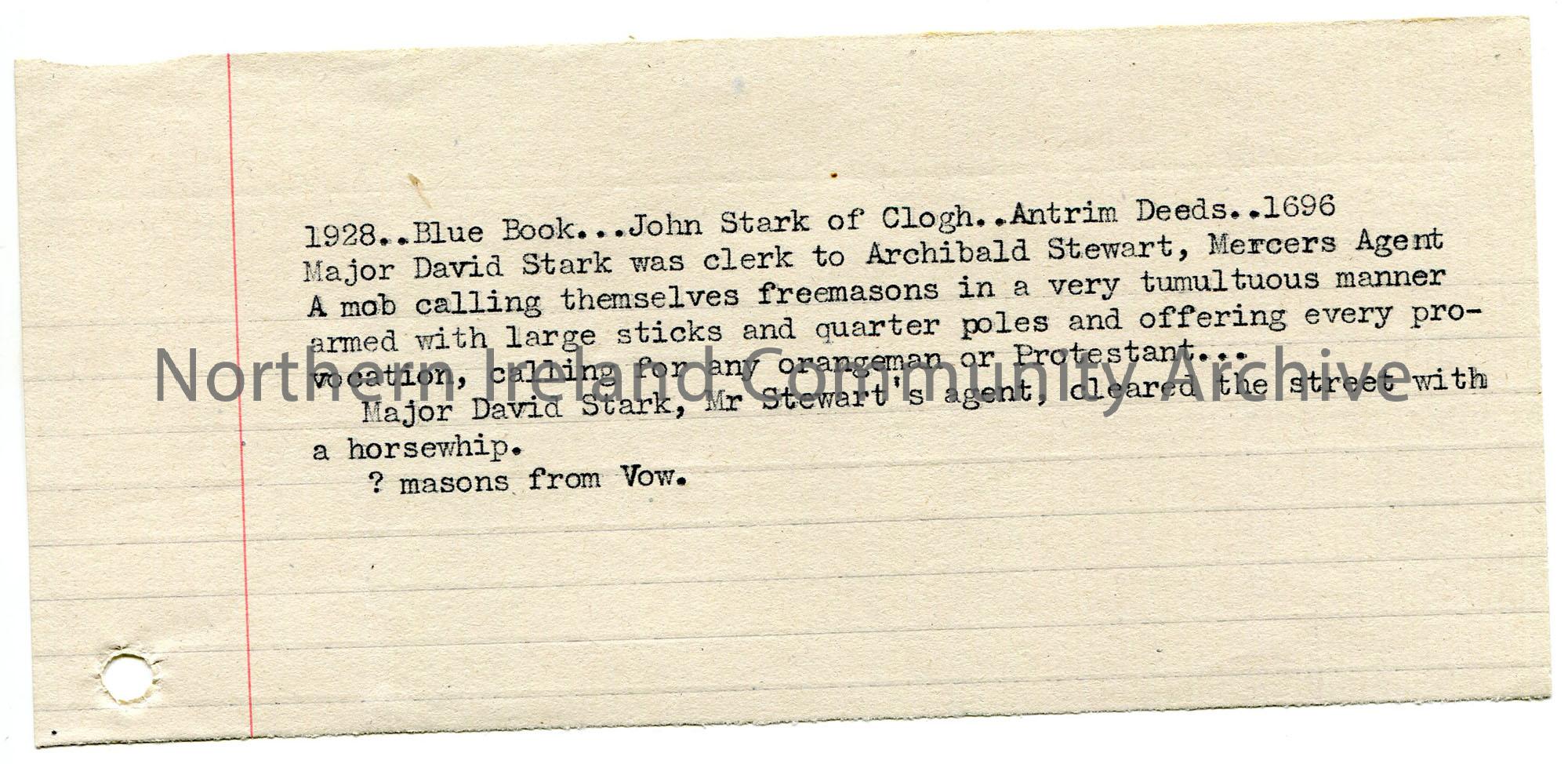 Typed note on lined paper which mentions John Stark of Clogh and Major David Stark, clerk to Archibald Stewart, Mercers Agent.