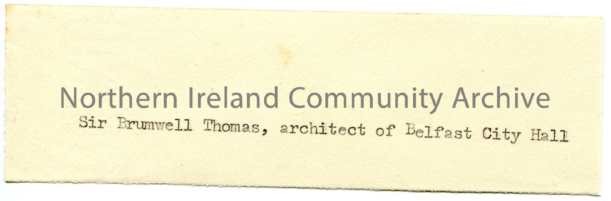 Typed note on small strip of paper. It reads, ‘Sir Cromwell Thomas, architect of Belfast City Hall.