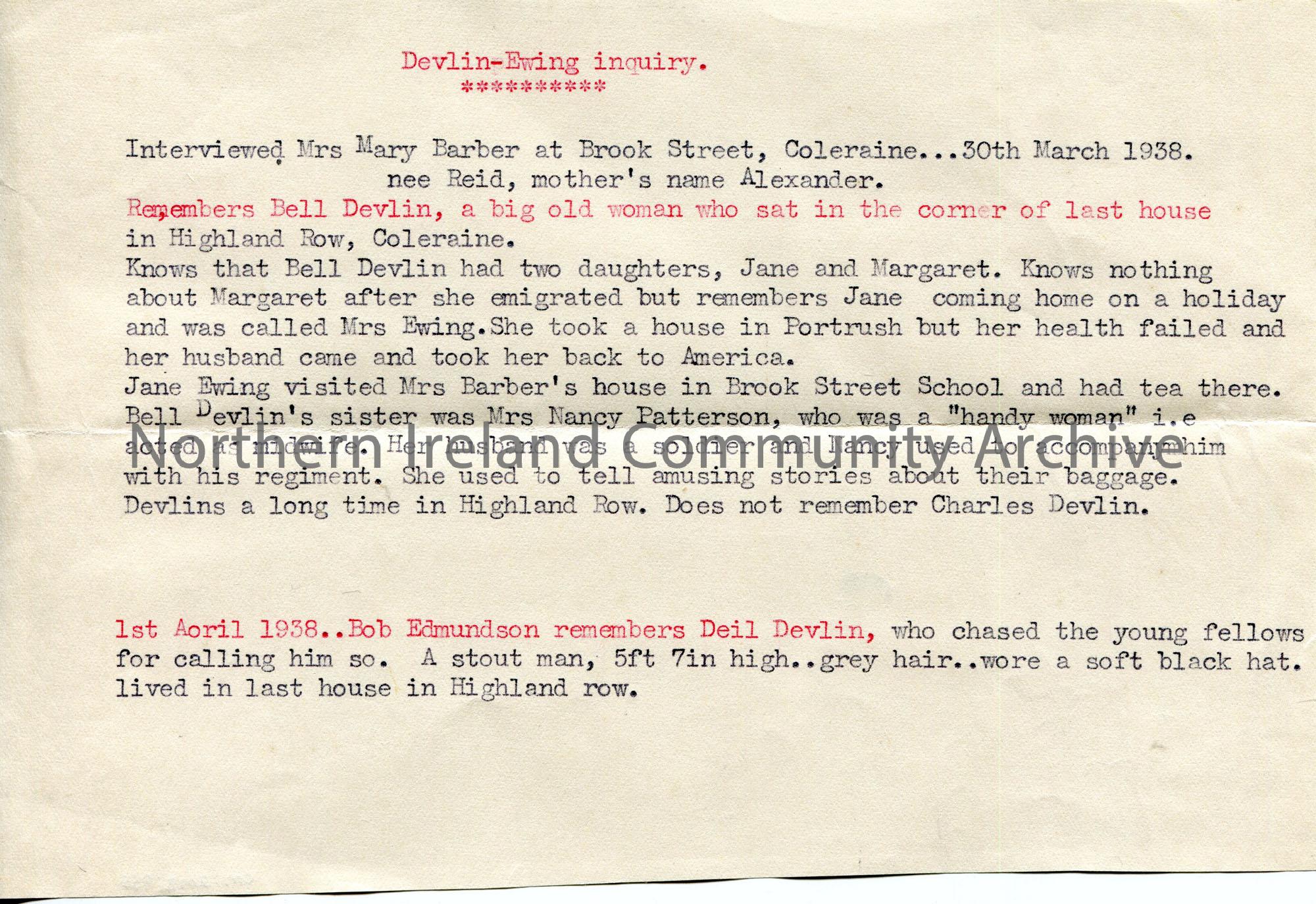 Typed note titled 'Devlin-Ewing inquiry'. Re family history information from an interview by Sam of Mrs Mary Barber, Brook Street, Coleraine on 30th March, 1938. Re Bell [Isabella] Devlin of Highland Row, Coleraine. Brief note from 1st April 1938 re Bob Edmundson remembering Deil Devlin of Highland Row, Coleraine.