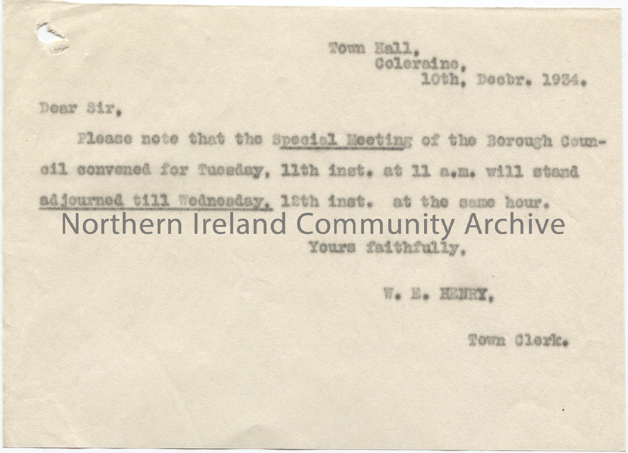 Typed note to adjourn the special meeting of the Councillors from 11th December to 12th December. From the Town Clerk - W. E. Henry.