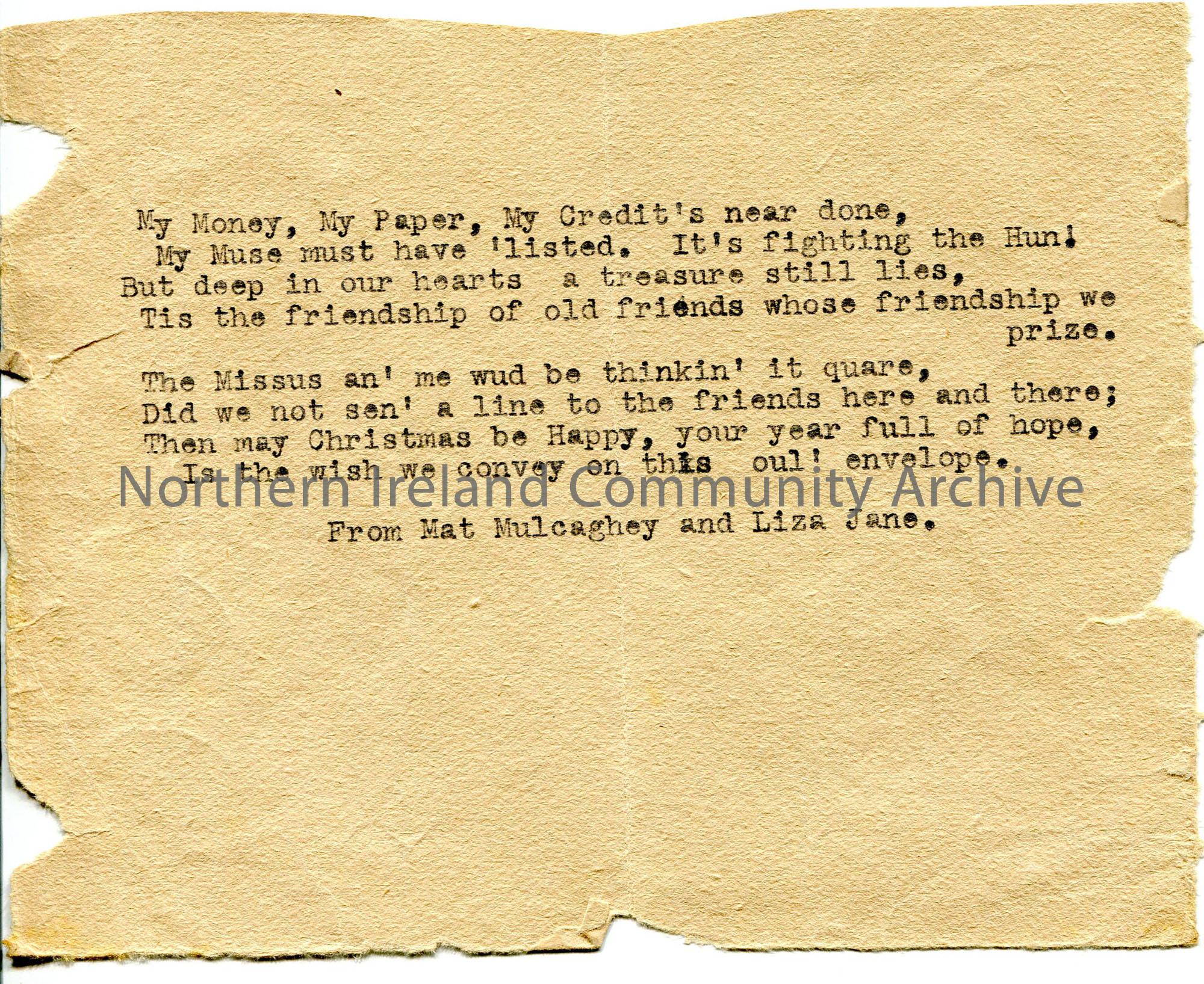 Typed note with words to untitled song – reverse has part of Fintona Co Tyrone address and 1d and 2d stamp. Song refers to being written on back of en…