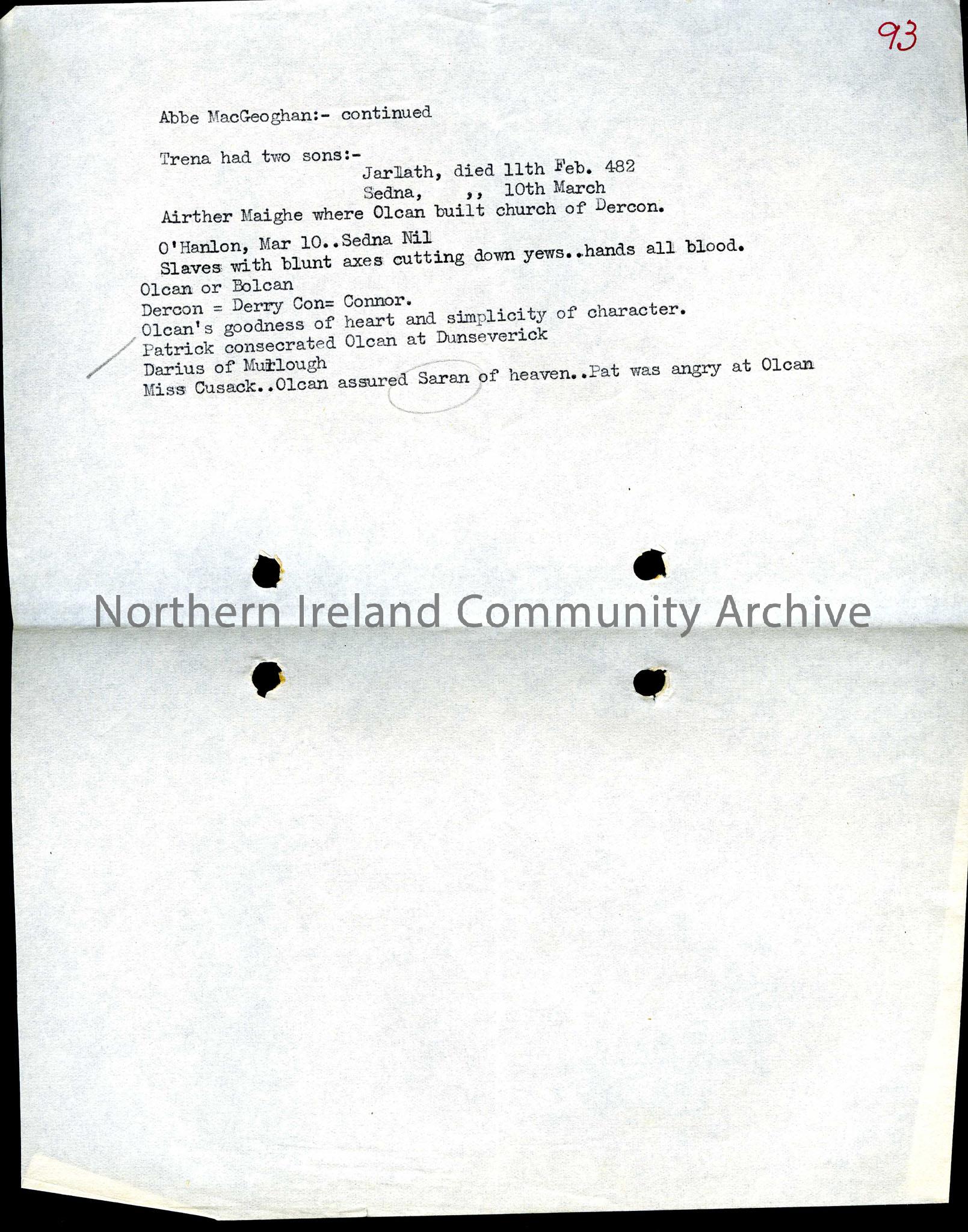 Typed notes ‘Abbe MacGeoghan:- continued’, mentions Trena, O’Hanlon, Olcan. Dercon, Darius of Murlough, Miss Cusack.