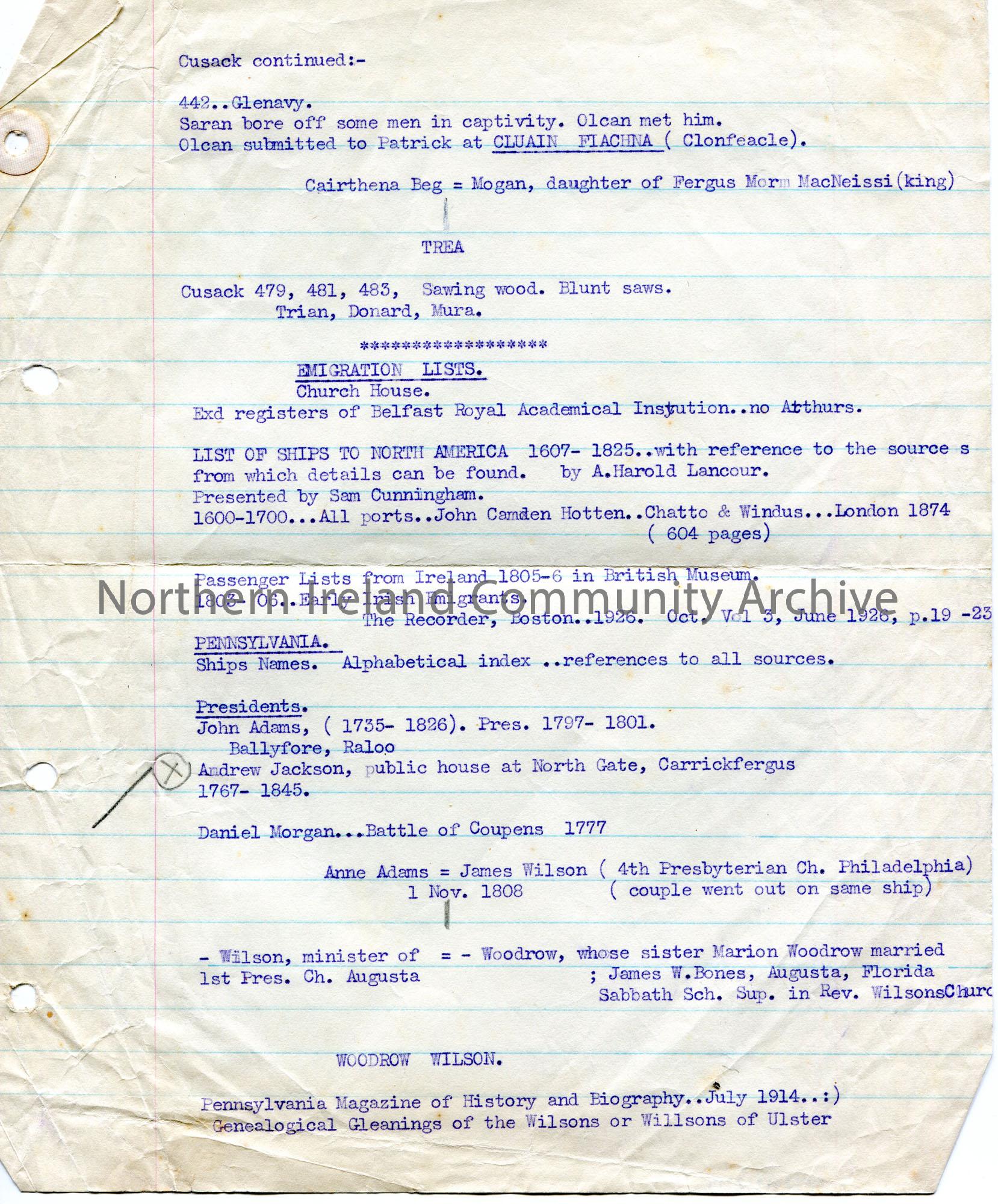 Typed notes appear to be taken from a book. Titled, 'Cusack continued:-'. Mentions St. Patrick; emigration lists of ships to North America; birthplace of American Presidents.