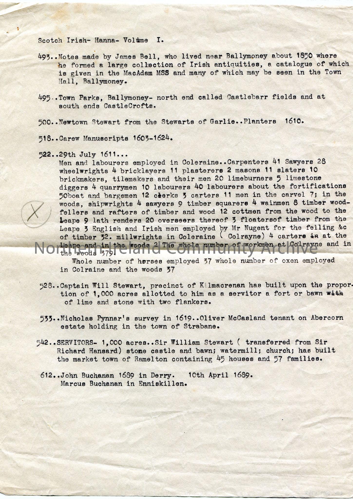 Typed notes appear to have been taken from 'Scotch Irish - Hanna - Volume I'. Re James Bell, Ballymoney; employment numbers and occupations in Coleraine on 29th July 1611; Captain Will Stewart, Kilmacrenan; Nicholas Pynnar's survey 1619; John Buchanan, Derry; Marcus Buchanan Enniskillen.