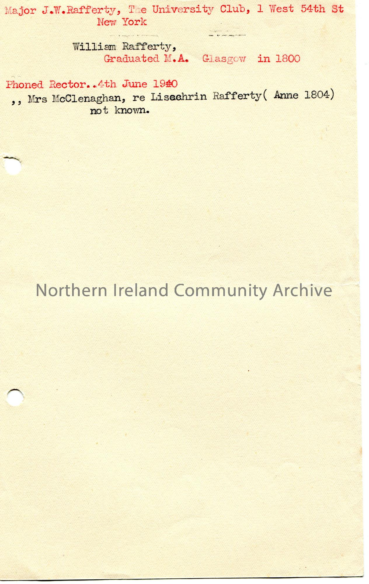 Typed notes by Sam Henry re Major J.W.Rafferty of New York and William Rafferty. Notes that he phoned Rector on 4th June 1940..Mrs McClenaghan..