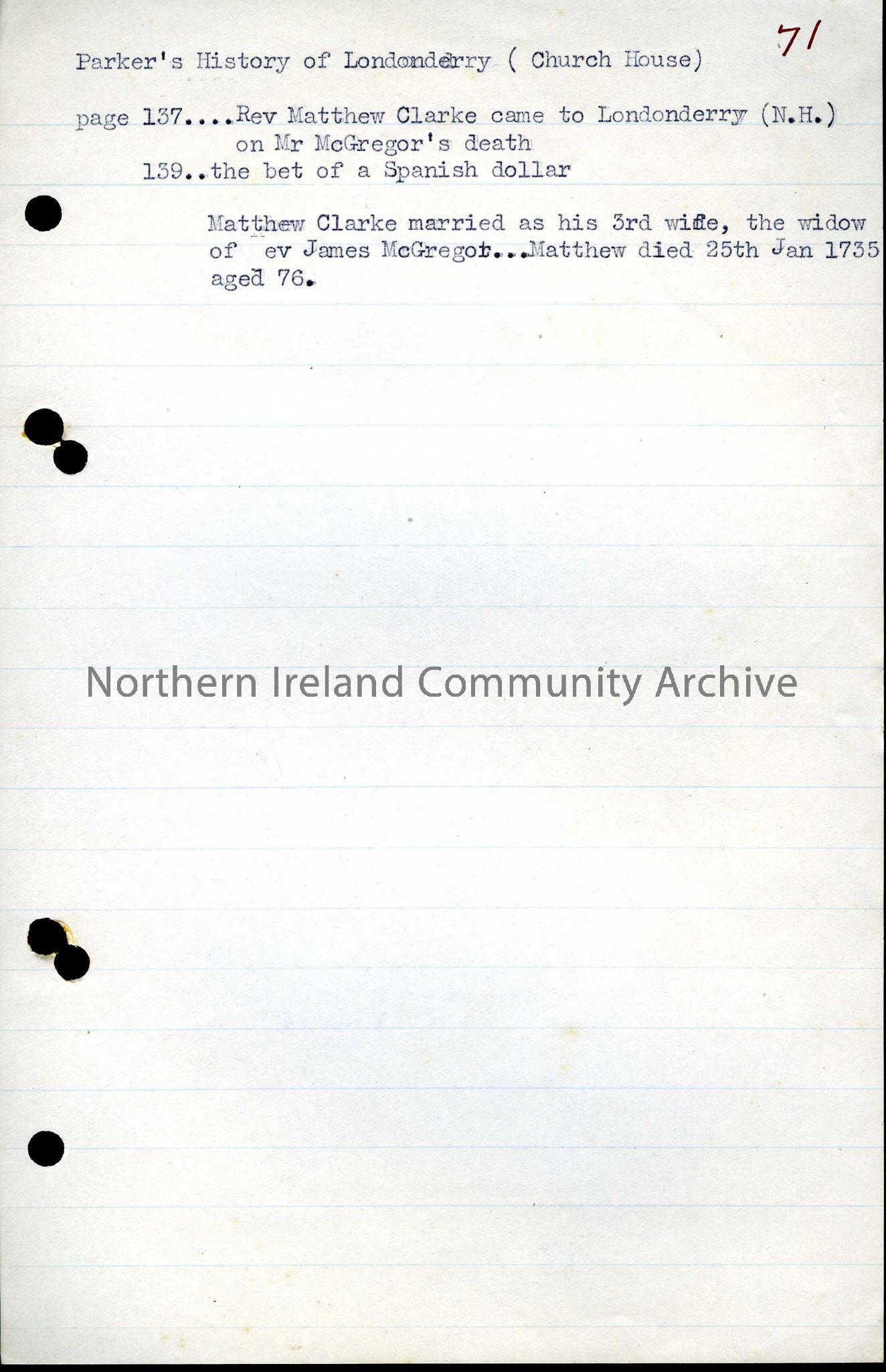 Typed notes detailing biographical details of Rev. Matthew Clarke, transcribed from Parker's History of Londonderry (Church House). Perhaps related to CM:2015:972.2.