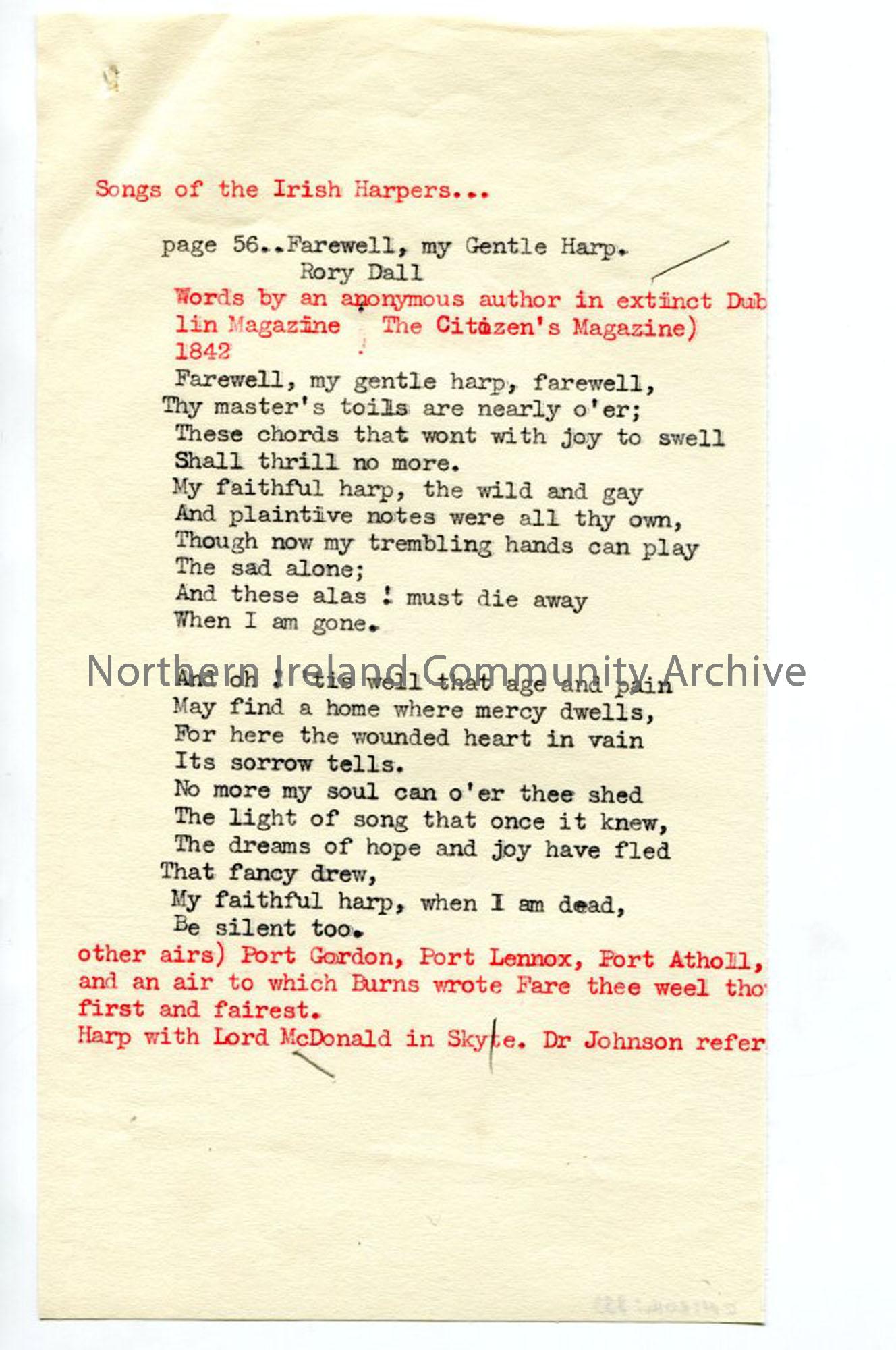 Typed notes entitled 'Songs of the Irish Harpers', with words to 'Farewell My Gentle Harp', author anonymous.
