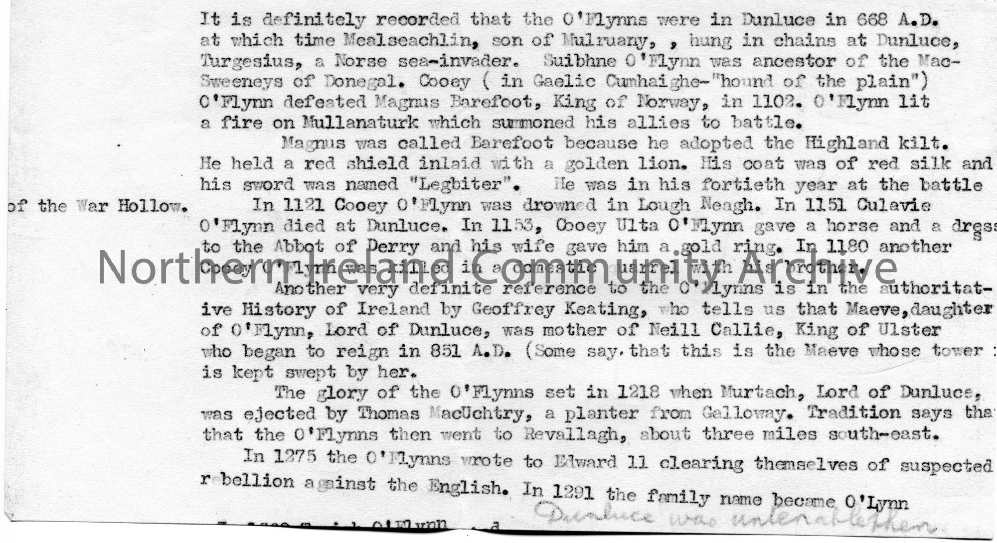Typed notes for draft of Sam Henry's book 'Dunluce and Giant's Causeway'. Re the O'Flynns in Dunluce.