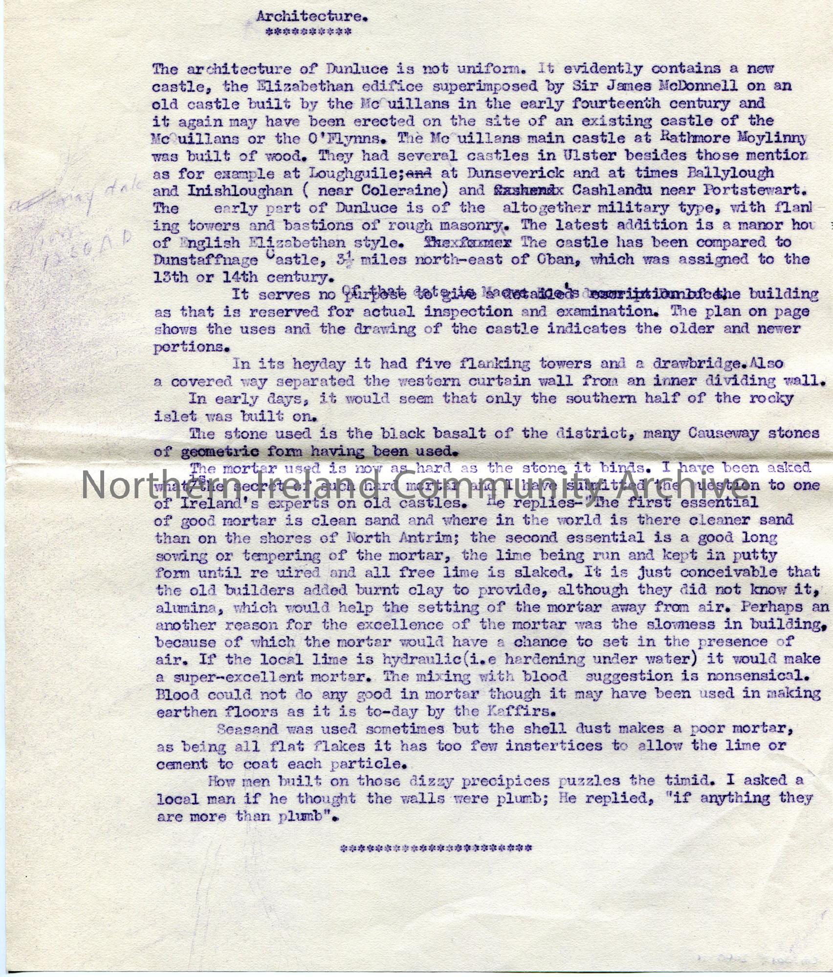 Typed notes for draft of Sam Henry’s book ‘Dunluce and Giant’s Causeway’. Titled, ‘Architecture’.