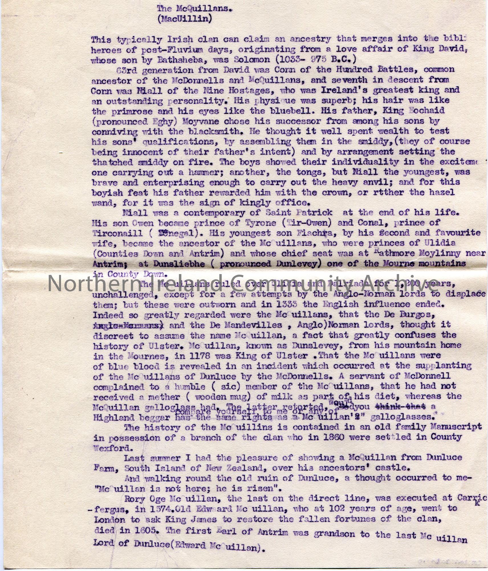 Typed notes for draft of Sam Henry’s book ‘Dunluce and Giant’s Causeway’. Titled, ‘The McQuillans (MacUillin)’.