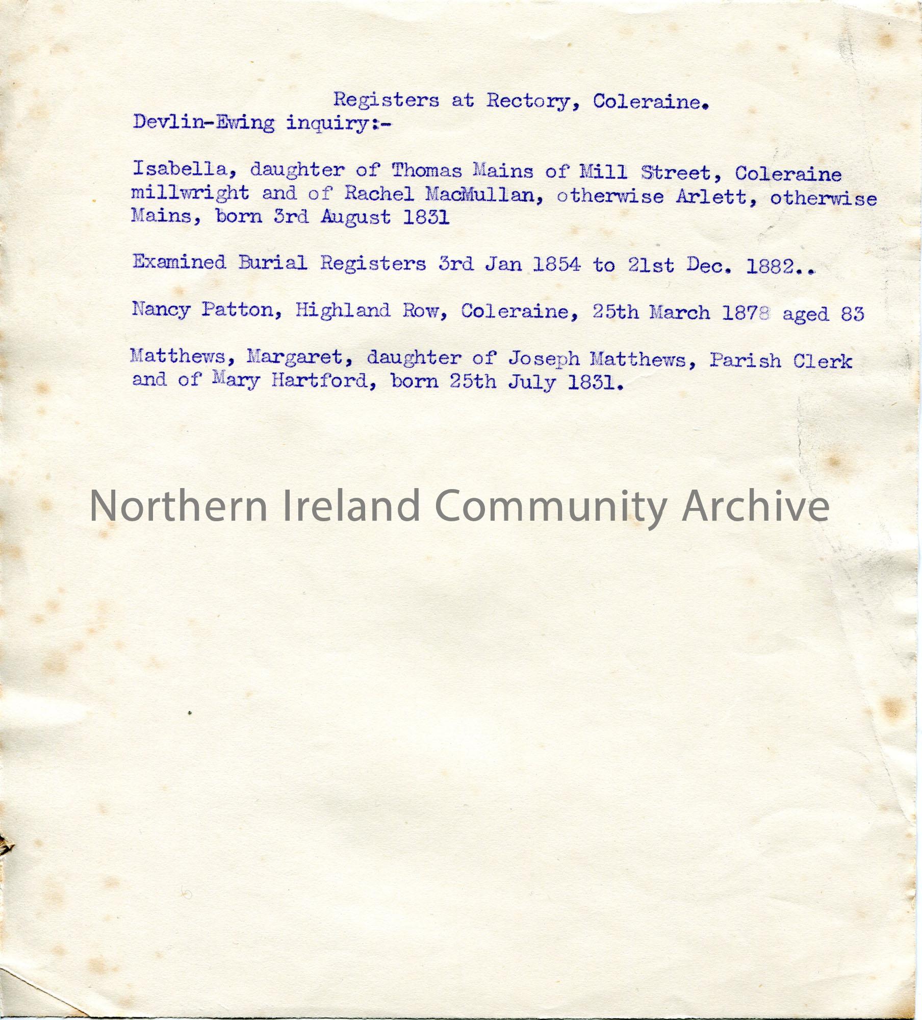 Typed notes for genealogy inquiry. Titled, ‘Registers at Rectory, Coleraine. Devlin-Ewing inquiry’. Re Isabella Devlin, daughter of Thomas Mains of Mi…