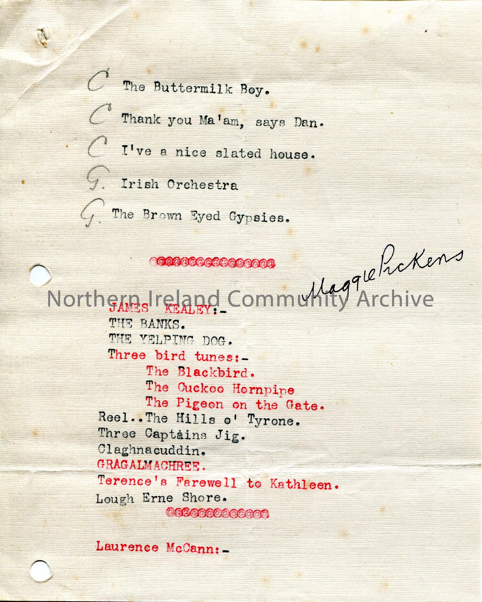 Typed notes for Irish Ceilidh on 21st January, 1935 in Coleraine Town Hall. Directed by Sam Henry. List of songs and refers to violinists James Kealey and Laurence McCann. The name Maggie Pickens is handwritten on page.