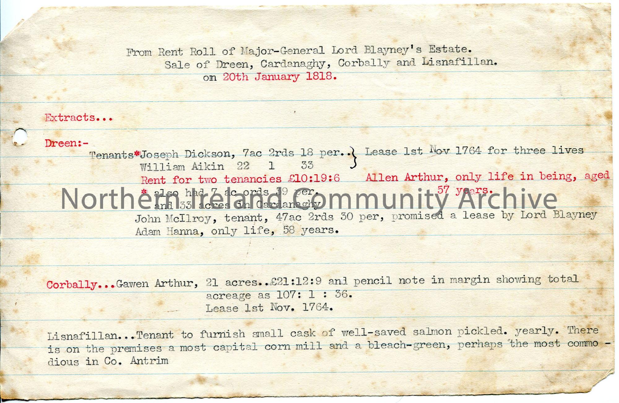 Typed notes from 1818 rent roll of Lord Blayney's estate for Dreen and Corbally - 1764 lease names include Arthur, Hanna and McIlroy - with some description.