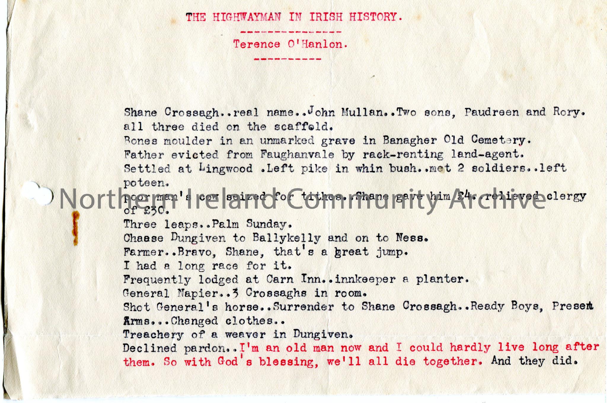 Typed notes from, ‘The Highwayman in Irish History’, by Terence O’Hanlon. Notes re Shane Crossagh – points in his life and career as a highwayman.