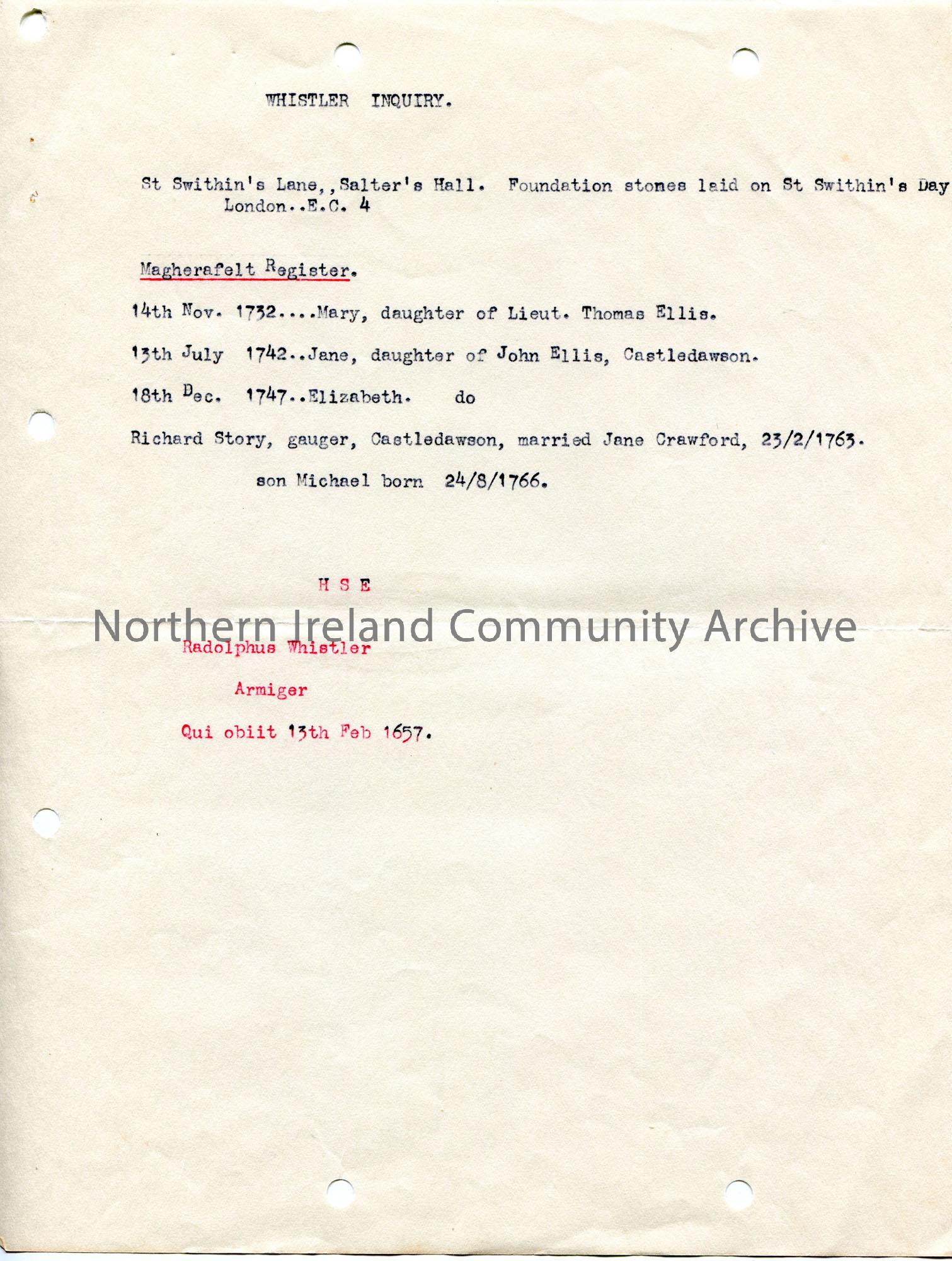 Typed notes headed ‘Whistler Inquiry’. Excerpts from Magherafelt Register.