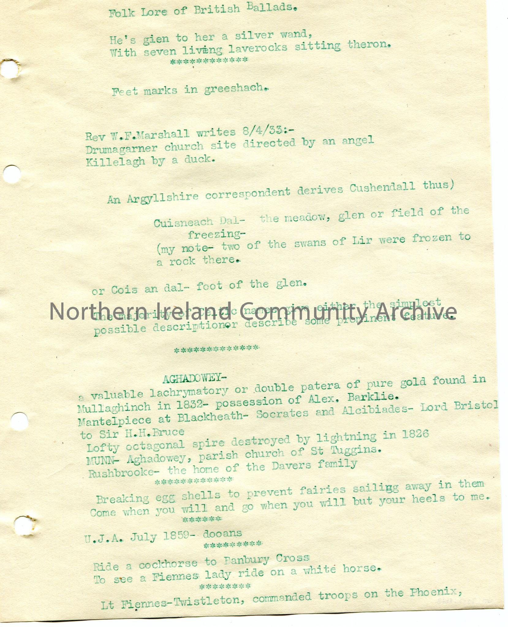 Typed notes in green ink re folk lore of Irish Ballads. Mentions Rev W. F. Marshall; Drumagarner; Cushendall; Aghadowey.