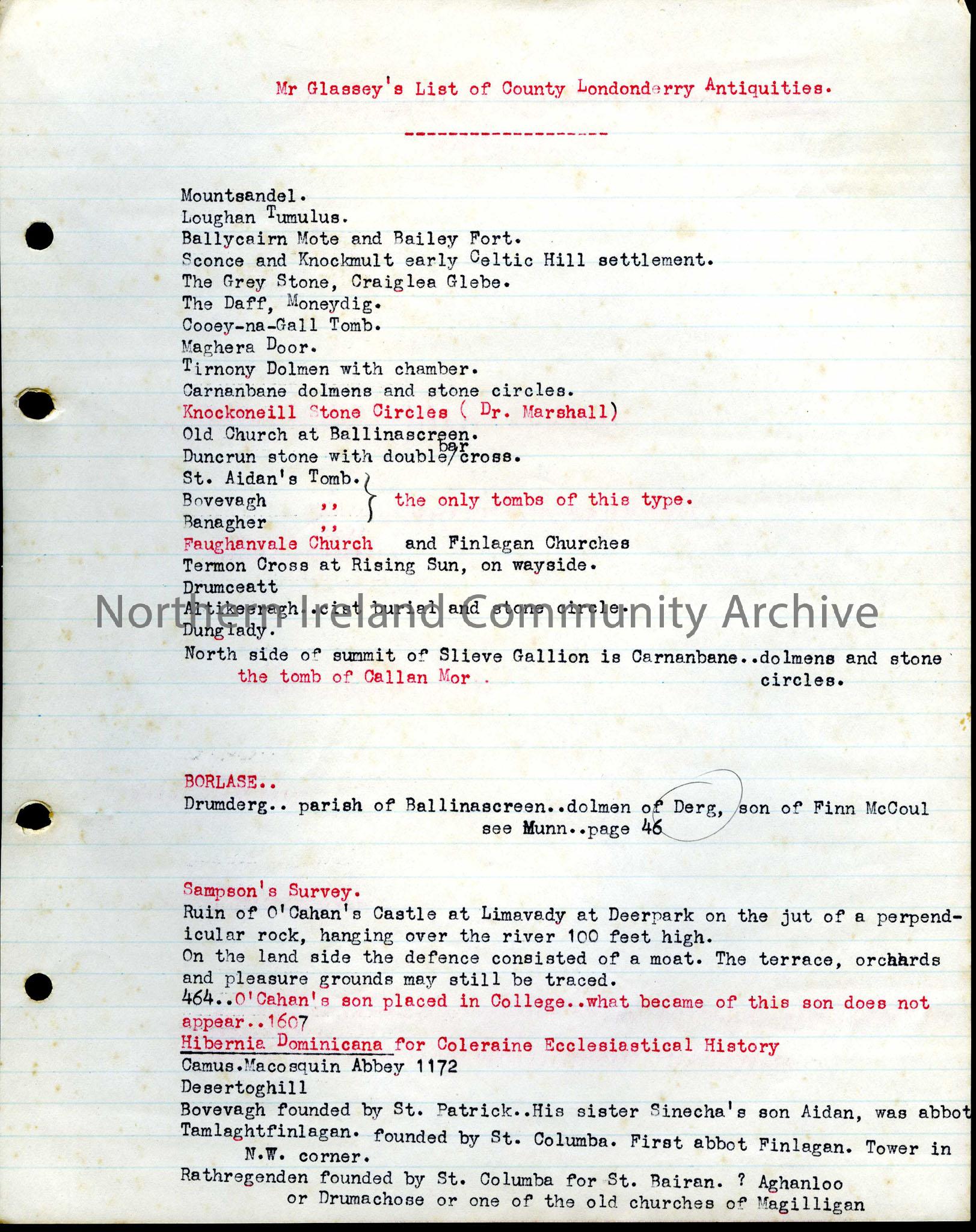 Typed notes - Mr Glassey's List of County Londonderry Antiquities. Mountsandel, Ballycairn, Sconce, St. Aidan's tomb are all mentioned.