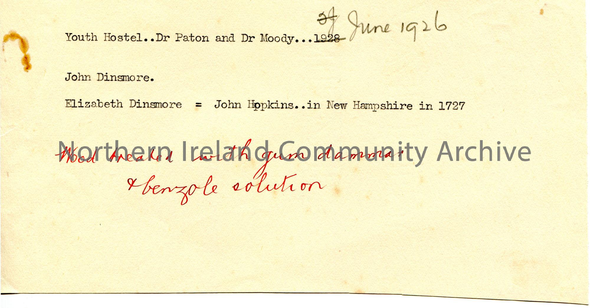 Typed notes not in context. Mentions Dr Paton and Dr Moody, John and Elizabeth Dinsmore. Handwritten note in red ink 'wood treated with gum dammar & benzole solution'.