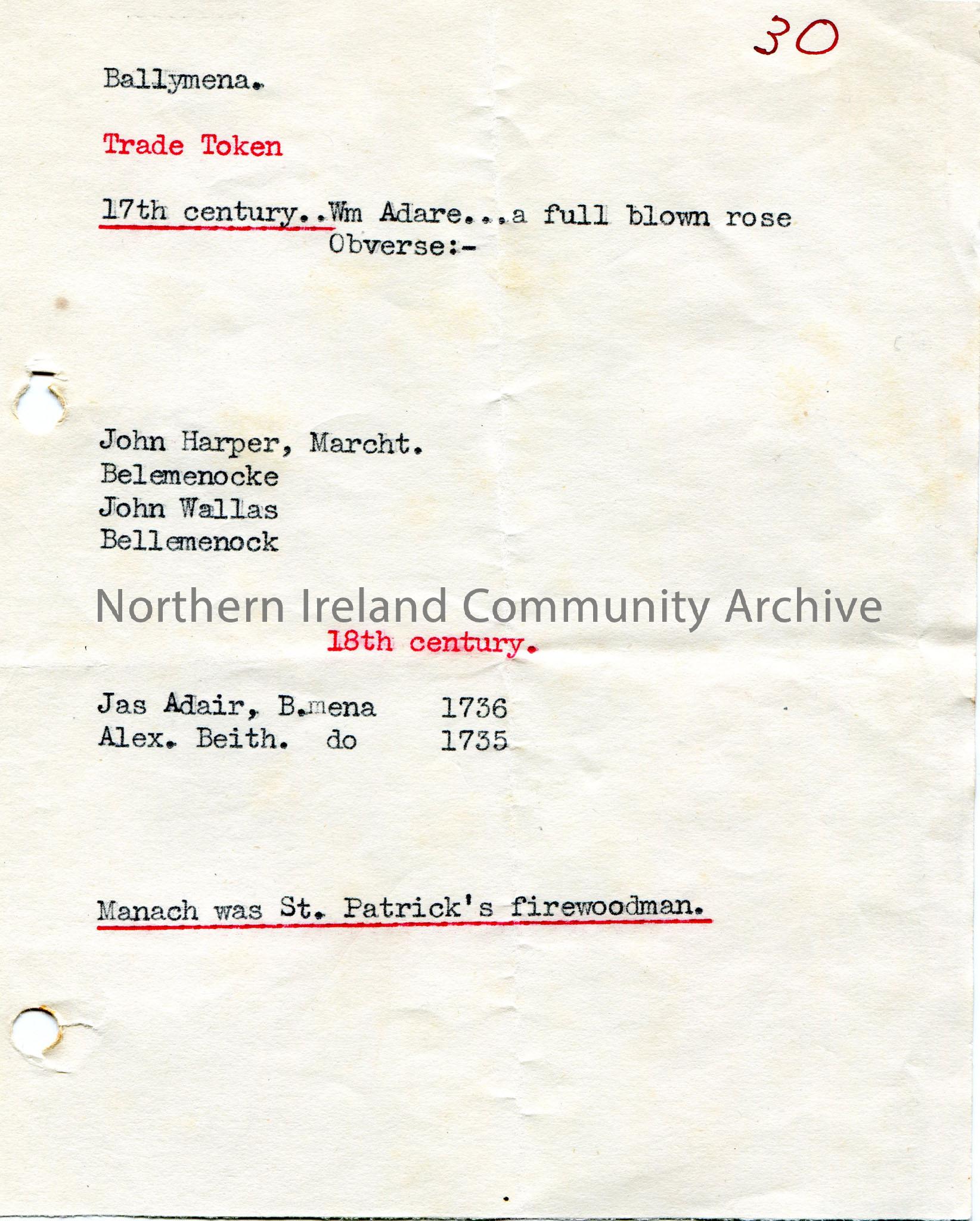 Typed notes not in context. Re Ballymena, Trade Token, John Harper and John Wallas, Jas Adair B.mena, Alex. Beith., Manach, St. Patrick, 17th and 18th century. Number '30' written in red top corner of page.