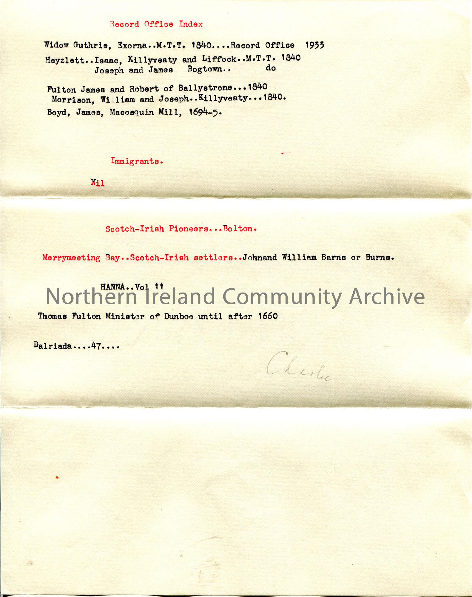 Typed notes of extracts from Record Office Index. This was genealogy research carried out for Miss Lida B Earhart, Washington. Mentions surnames Guthrie Heyzlett [Hezlett], Fulton, Boyd, Barns, Barnes.