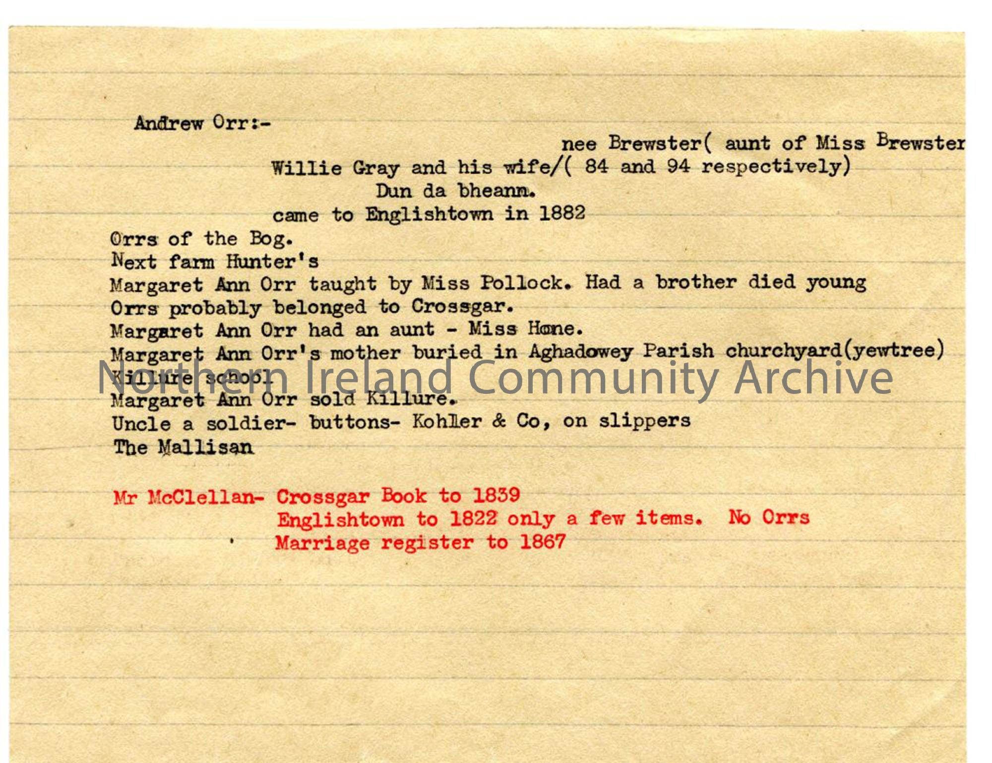 Typed notes of genealogical interest relating to Andrew Orr.