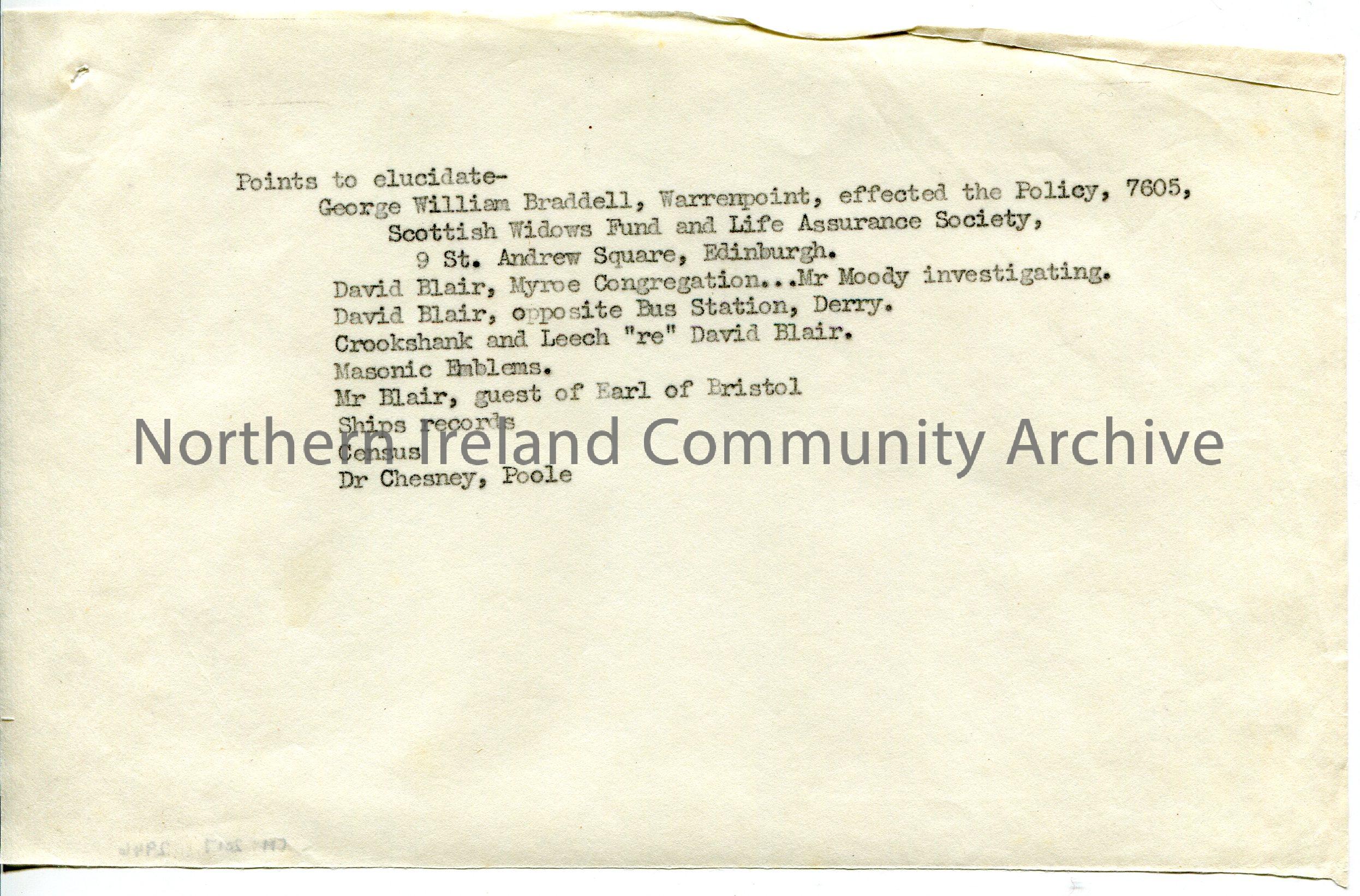 Typed notes of ‘Points to elucidate’. Notes not in context but refer to David Blair.