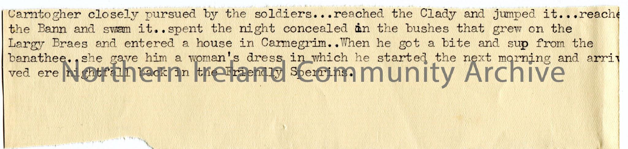 Typed notes on a strip of paper re a man who was pursued by soldiers and ended up back in the Sperrins.