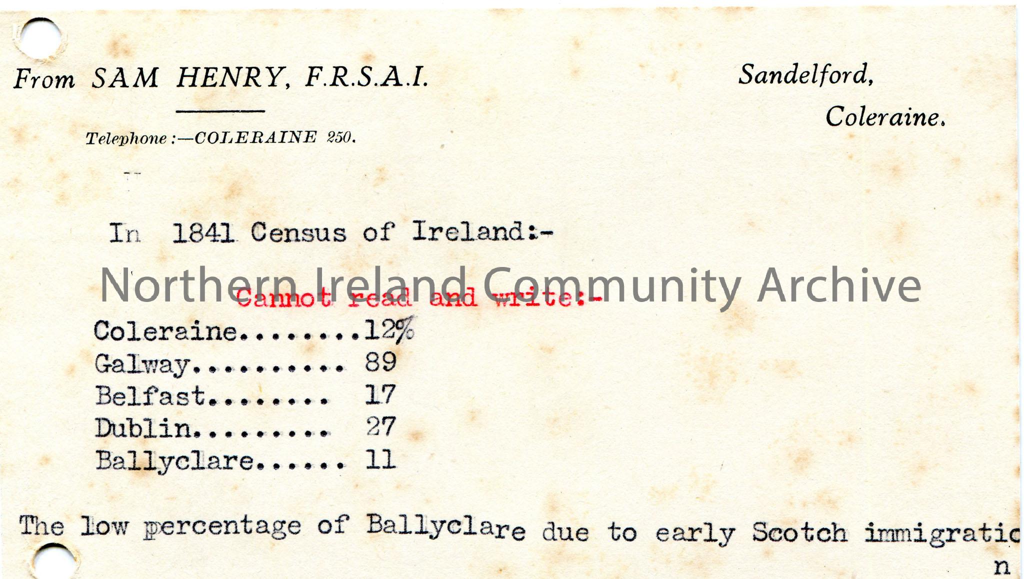 Typed notes on back of a blank postcard re 1841 census of Ireland. Notes the percentage of the population of towns and cities who cannot read can write. Mentions Coleraine, Galway, Belfast, Dublin and Ballyclare.
