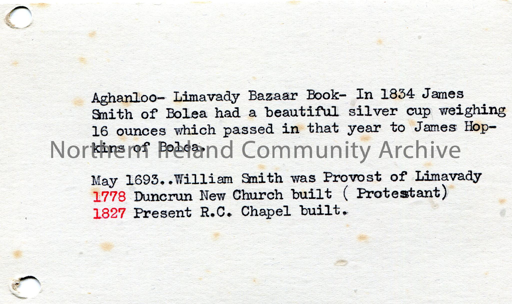Typed notes on back of a blank postcard re Aghanloo. Mentions James Smith and James Hopkins of Bolea and William Smith, Provost of Limavady.