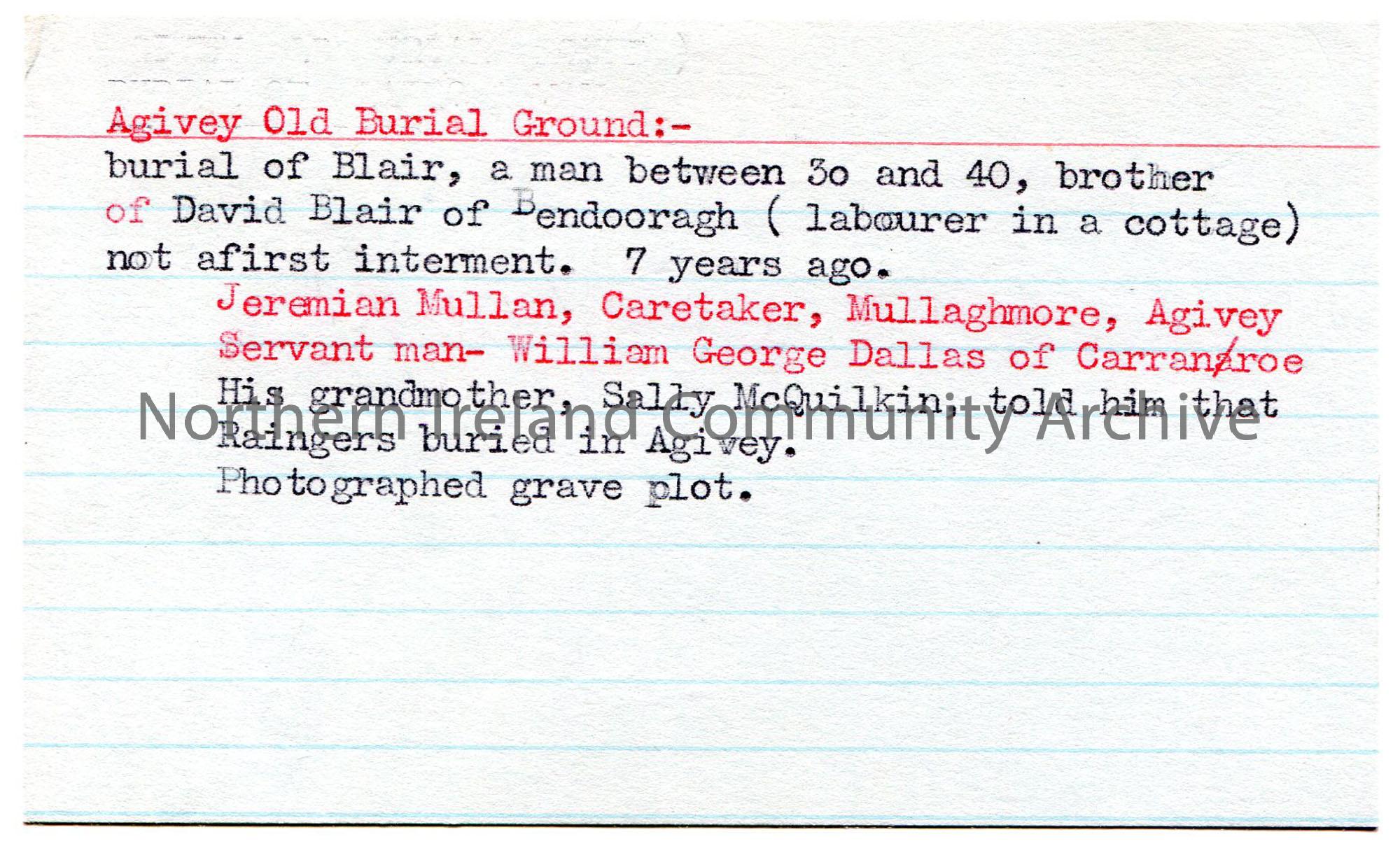 Typed notes on blue coloured lined card re genealogical information from Agivey Old Burial Ground, Re the family name Blair and Jeremian Mullan of Mullaghmore, Agivey. Handwritten notes on back in pencil mention Anne ONeill, Dr Johnson and Killowen.