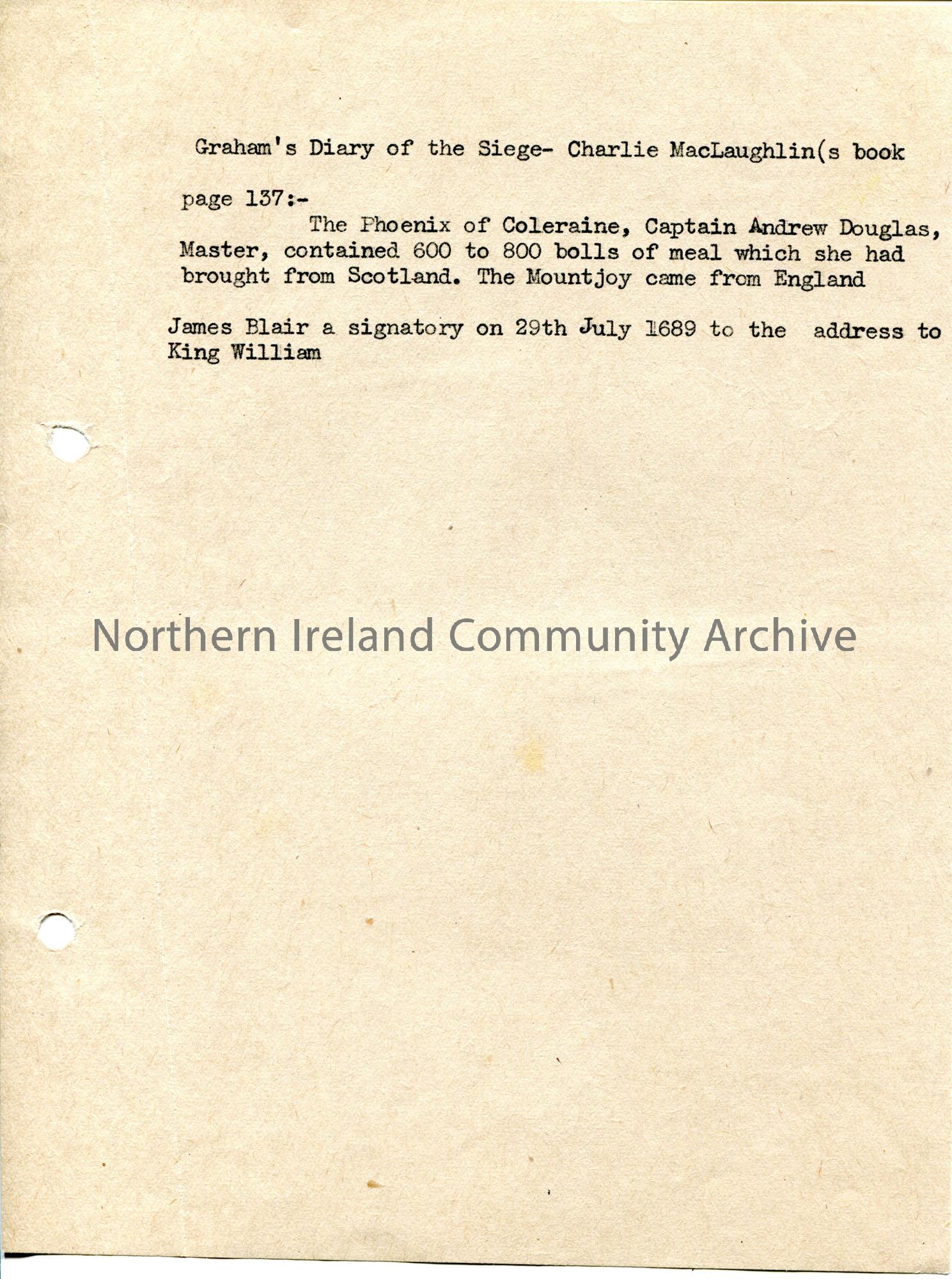 Typed notes on brown colour paper titled, 'Graham's Diary of the Siege - Charlie MacLaughlin's book'. An extract re the Phoenix of Coleraine, Captain Andrew Douglas, contained 600-800 bolls of meal from Scotland. Mentions signatory James Blair on 29th July 1689 to the address to King William.