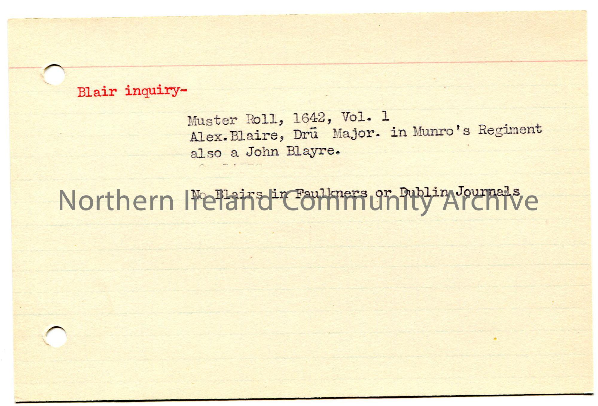 Typed notes on lined card of genealogical information re family name Blair. Mentions Alex Blaire and John Blayre which are referenced in the Muster Roll, 1642, Vol. 1.