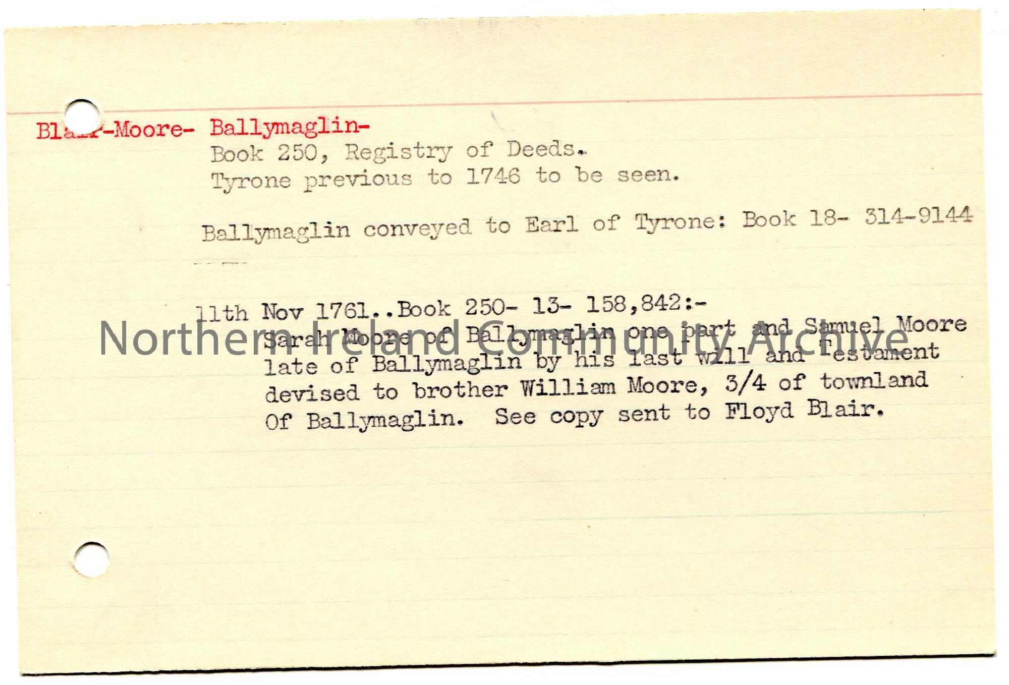 Typed notes on lined card of genealogical information re family name Blair. Mentions Sarah Moore and the last will and Testament of Samuel Moore of Ballymaglin.