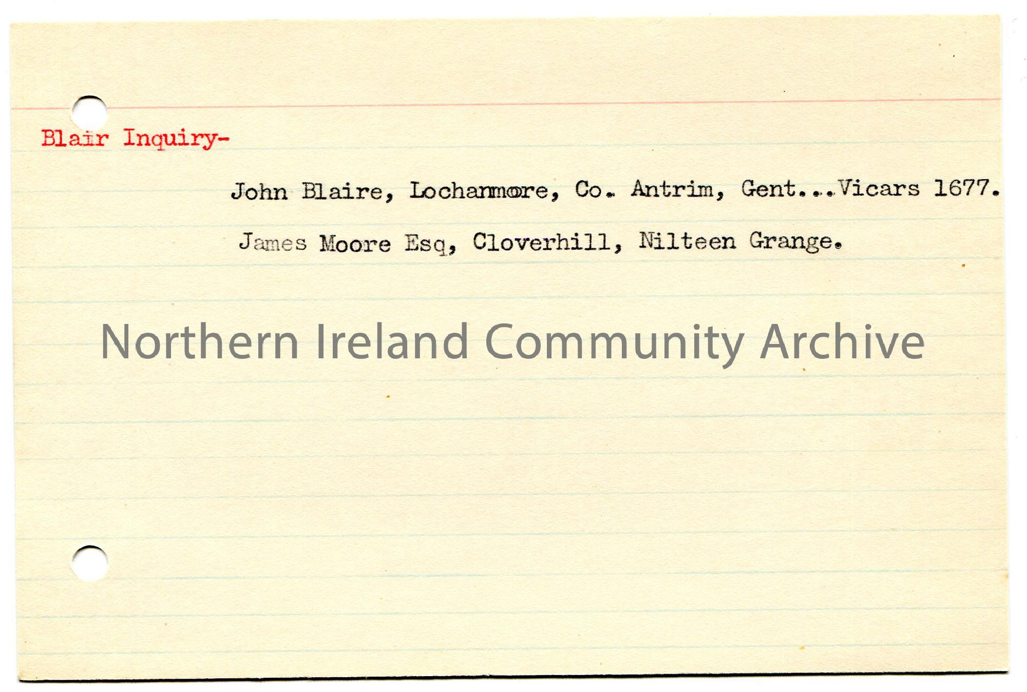 Typed notes on lined card of genealogical information re family name Blair. Titled, 'Blair Inquiry'. Mentions John Blaire, Lochanmore and James Moore, Cloverhill.
