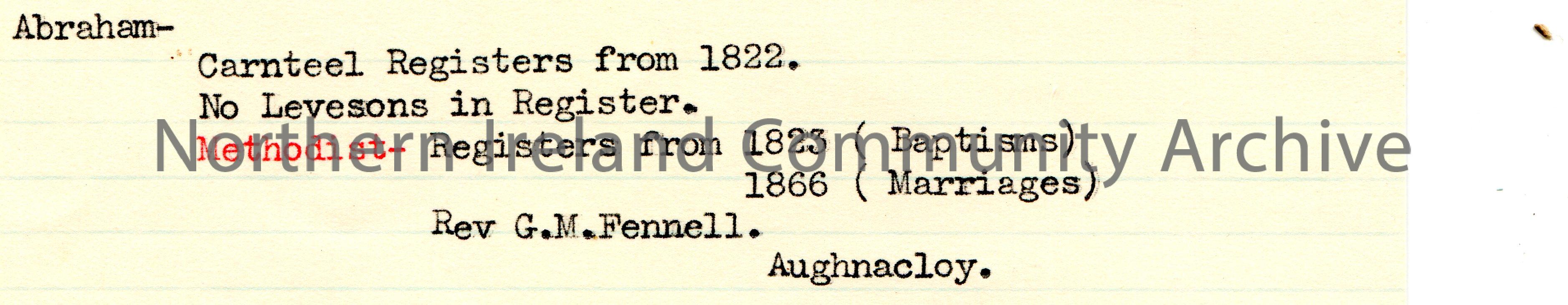 Typed notes on lined card re 19th century Baptism and Marriage registers for the surname Abraham. Mentions Carnteel and Aughnacloy. Refers to Rev. G. M. Fennell.