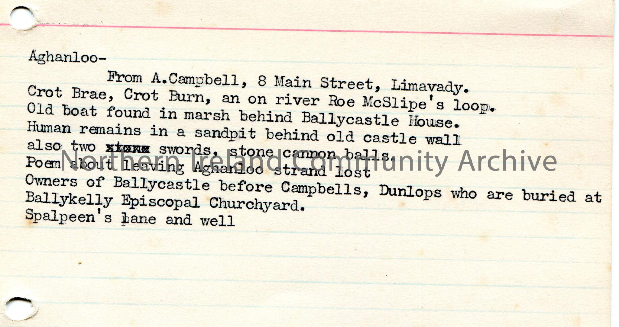 Typed notes on lined card re Aghanloo. Mentions Ballycastle, family names Campbell and Dunlop.