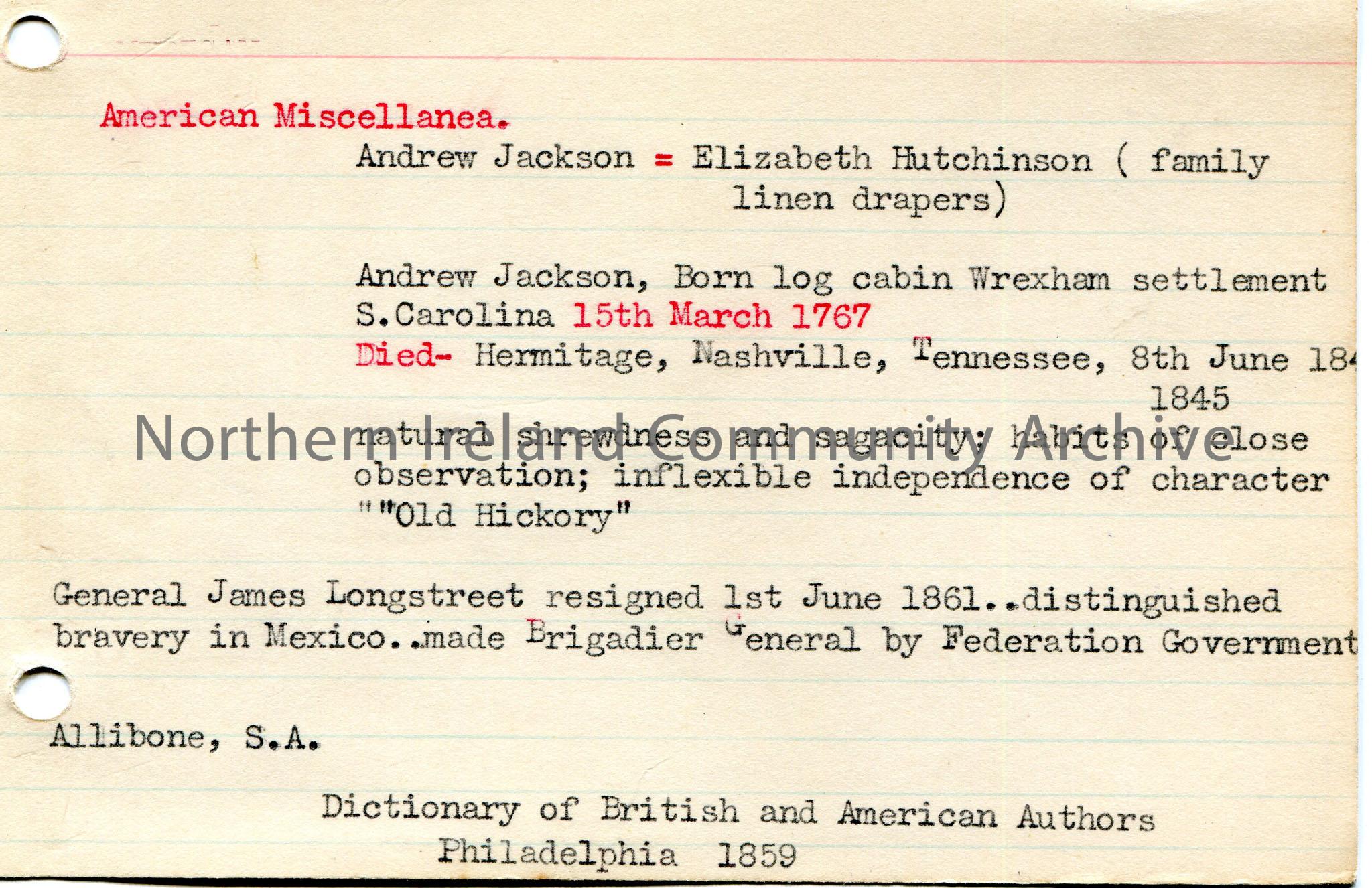 Typed notes on lined card re American Miscellanea. Mentions Andrew Jackson.