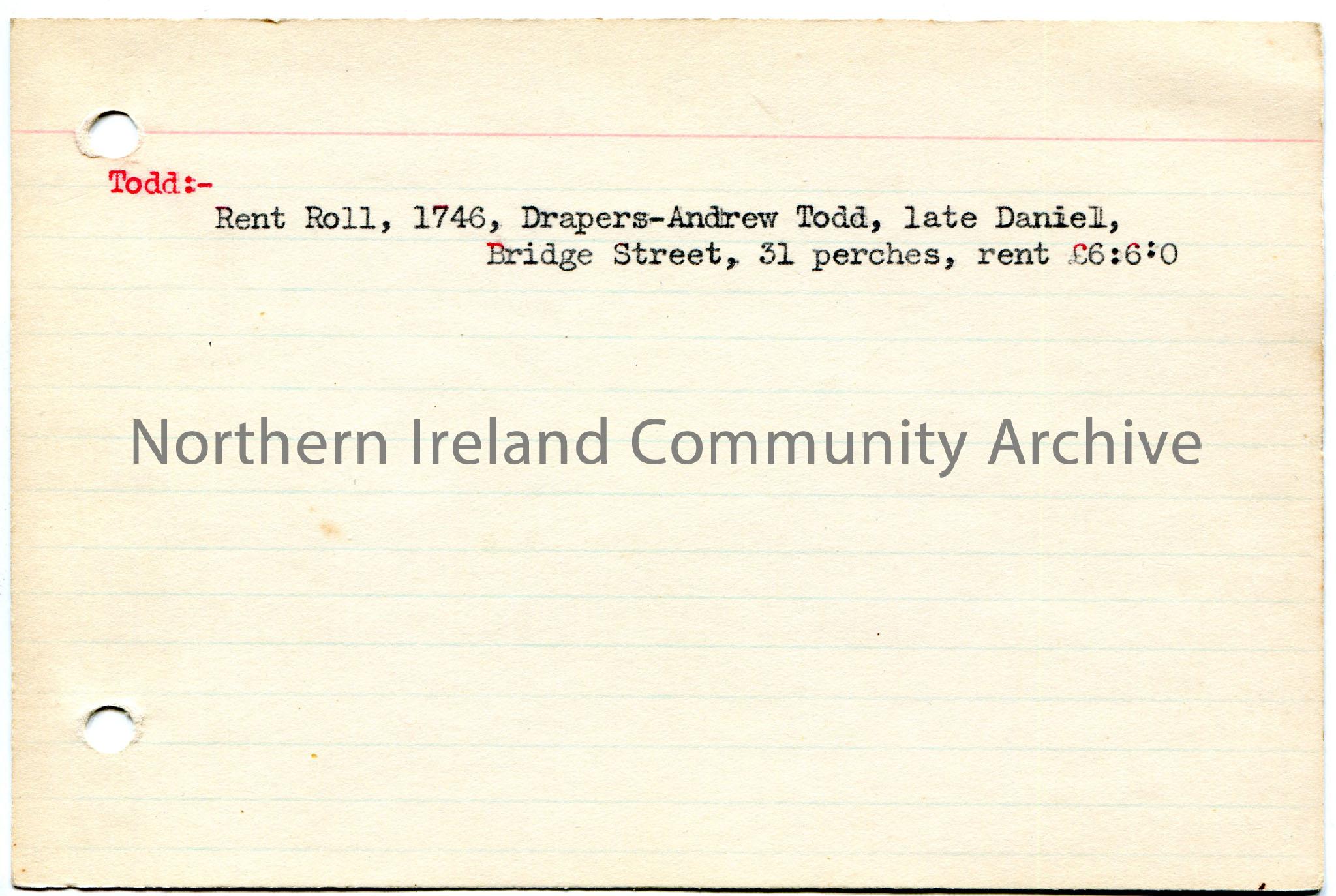 Typed notes on lined card re Andrew Todd. Taken from the Rent Roll of 1746. Lived at Bridge Street.