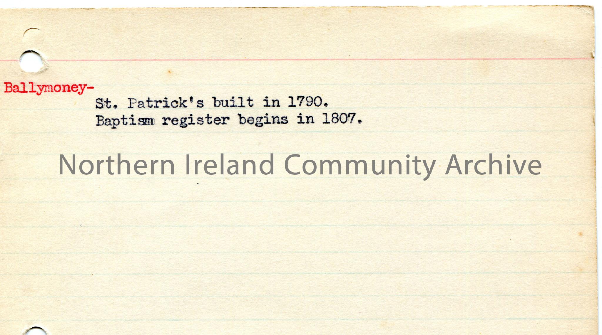 Typed notes on lined card re Ballymoney. Mentions St Patrick's and Baptism register.